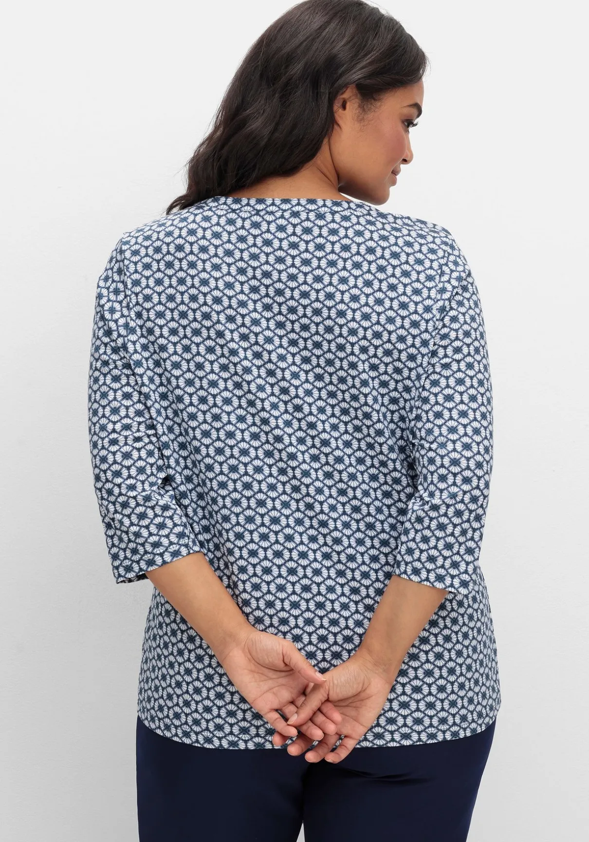 Jerseyshirt mit 3/4-Arm. Mit Trendbewusstsein und Retro-Charme überzeugt der grafische Alloverdruck. Am Ausschnitt ist das Shirt mit kleinem V-Schlitz und kurzer Knopfleiste gearbeitet, 3/4-lange Ärmel ergänzen den entspannten Look.