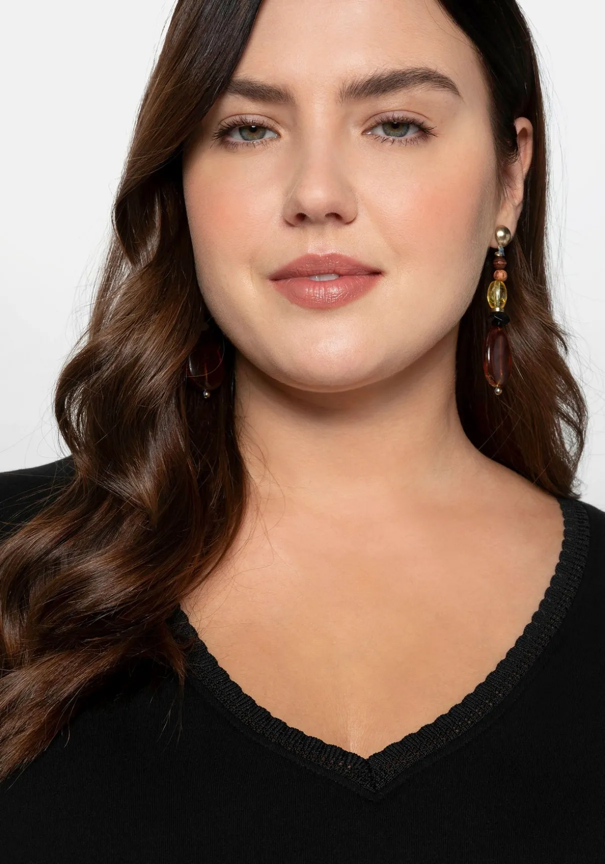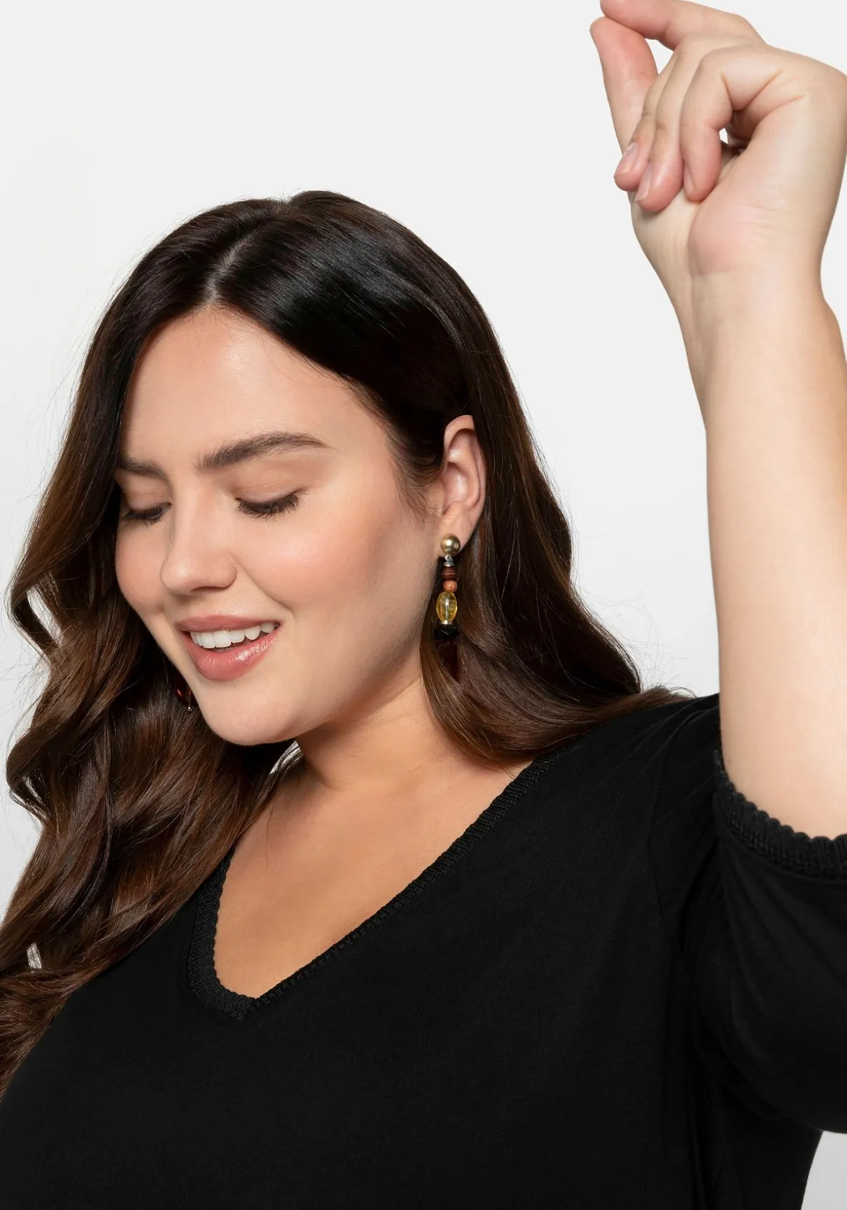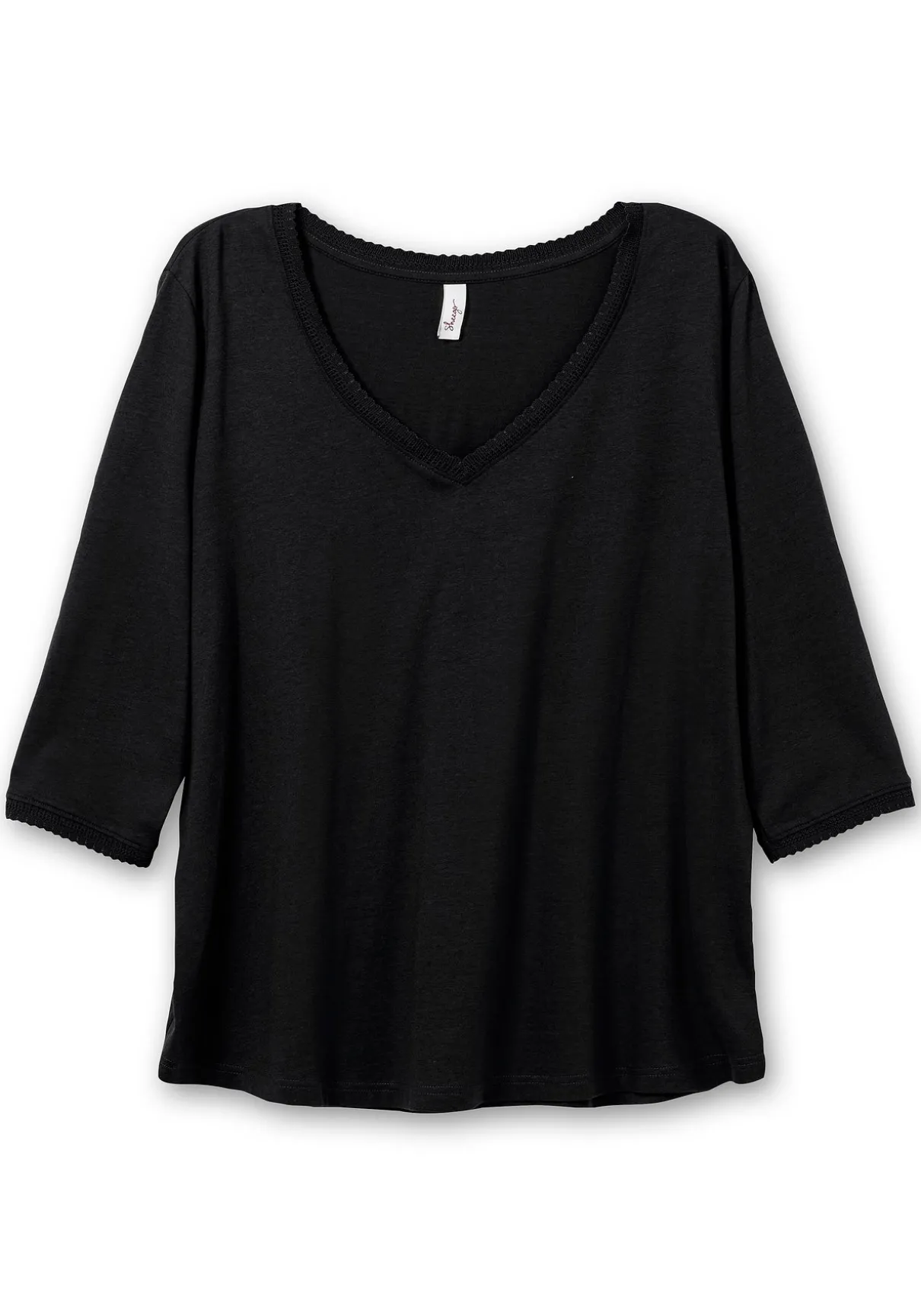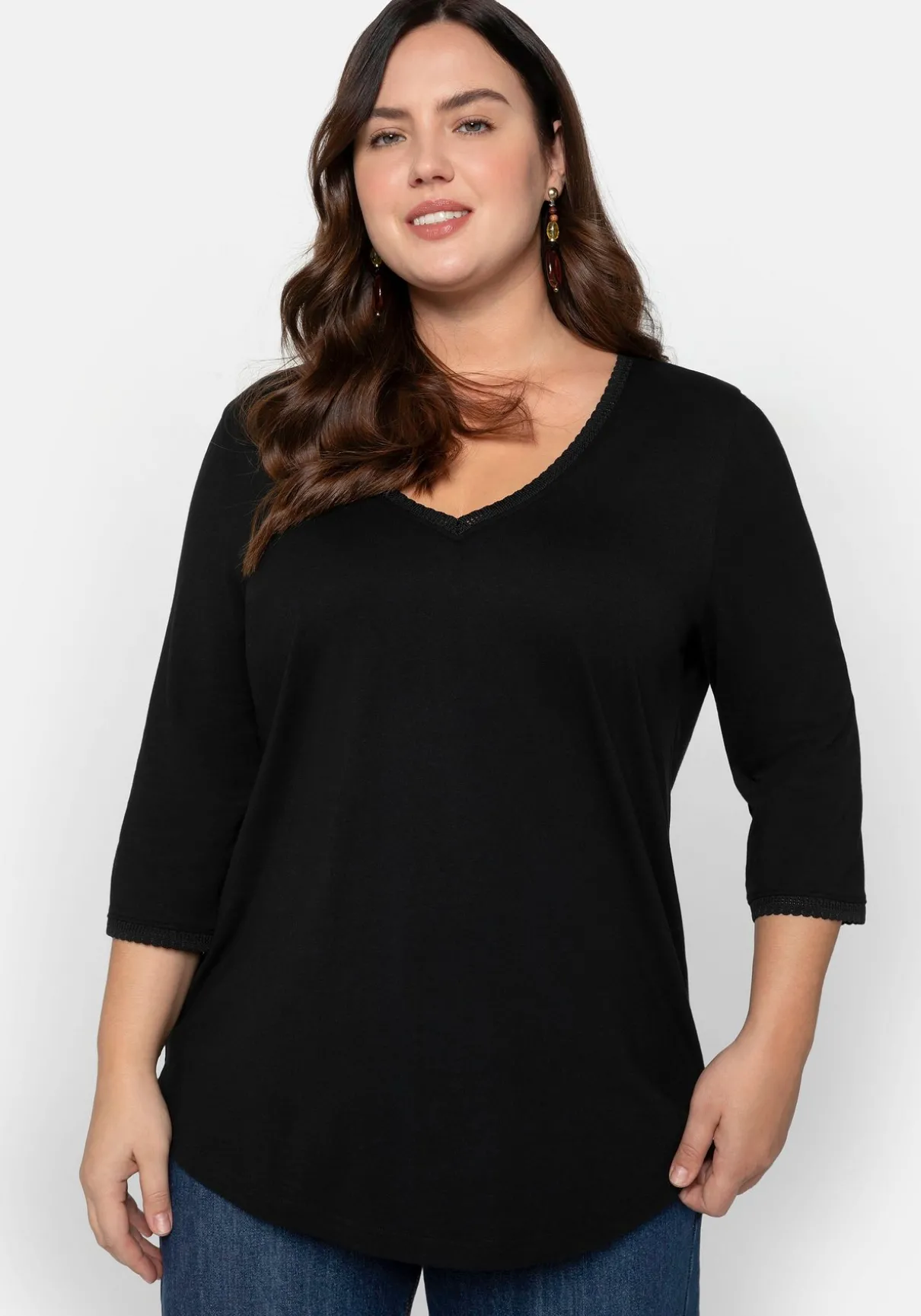 Jerseyshirt mit 3/4-Arm. Das schlichte, kombistarke Shirt zeigt sich mit V-Ausschnitt und leicht gerundetem Saum. Als feminines Finish dient die mit einer zarten Bogenkante verzierte Rippblende am Ausschnitt und am Ärmelsaum.