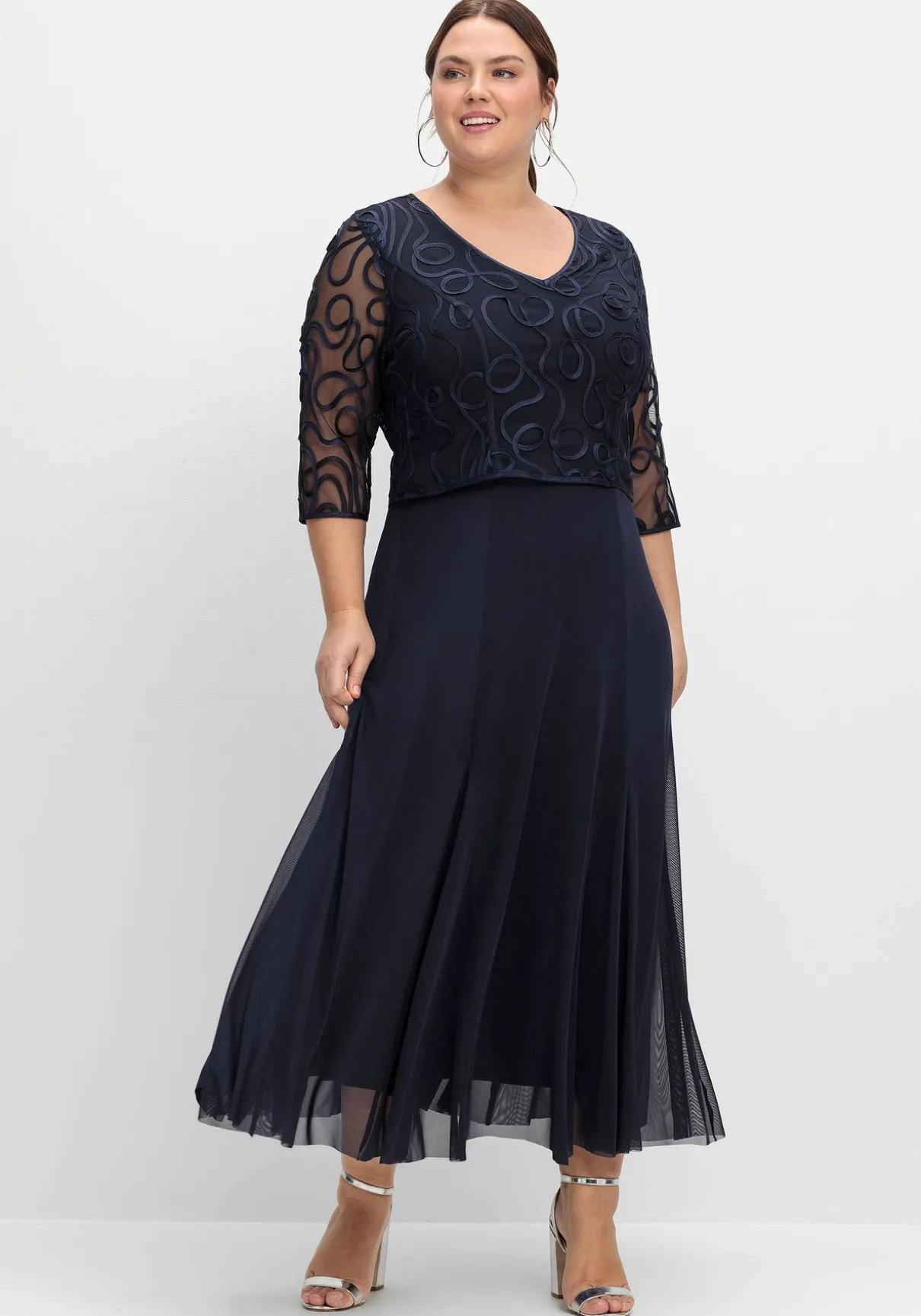 Abendkleid in Lagenoptik. Das mit aufwendigen Zierborten gestaltete Oberteil ist leicht transparent und lässt an den 3/4-langen Ärmeln raffiniert die Haut durchschimmern. Der elegante Rock erhält durch die Godet-Einsätze schwungvolle Weite. Dazu kommen ein femininer V-Ausschnitt sowie ein nahtfeiner Reißverschluss, der ein leichtes An- und Ausziehen ermöglicht.