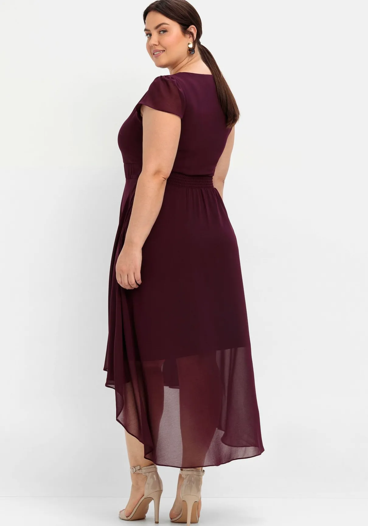Dieses Abendkleid sorgt für einen hinreißend eleganten Auftritt. Kurze, transparente Flügelärmel zaubern feminine Raffinesse. Ein figurfreundlicher V-Ausschnitt setzt das Dekolleté gekonnt in Szene. Hinten länger als vorn geschnitten, verspricht das Rockteil einen besonders schönen Fall. Geöffnet wird das Kleid durch einen seitlichen, nahtfeinen Reißverschluss.