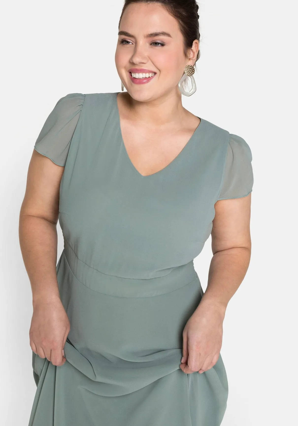 Dieses Abendkleid sorgt für einen hinreißend eleganten Auftritt. Kurze, transparente Flügelärmel zaubern feminine Raffinesse. Ein figurfreundlicher V-Ausschnitt setzt das Dekolleté gekonnt in Szene. Hinten länger als vorn geschnitten, verspricht das Rockteil einen besonders schönen Fall. Geöffnet wird das Kleid durch einen seitlichen, nahtfeinen Reißverschluss.