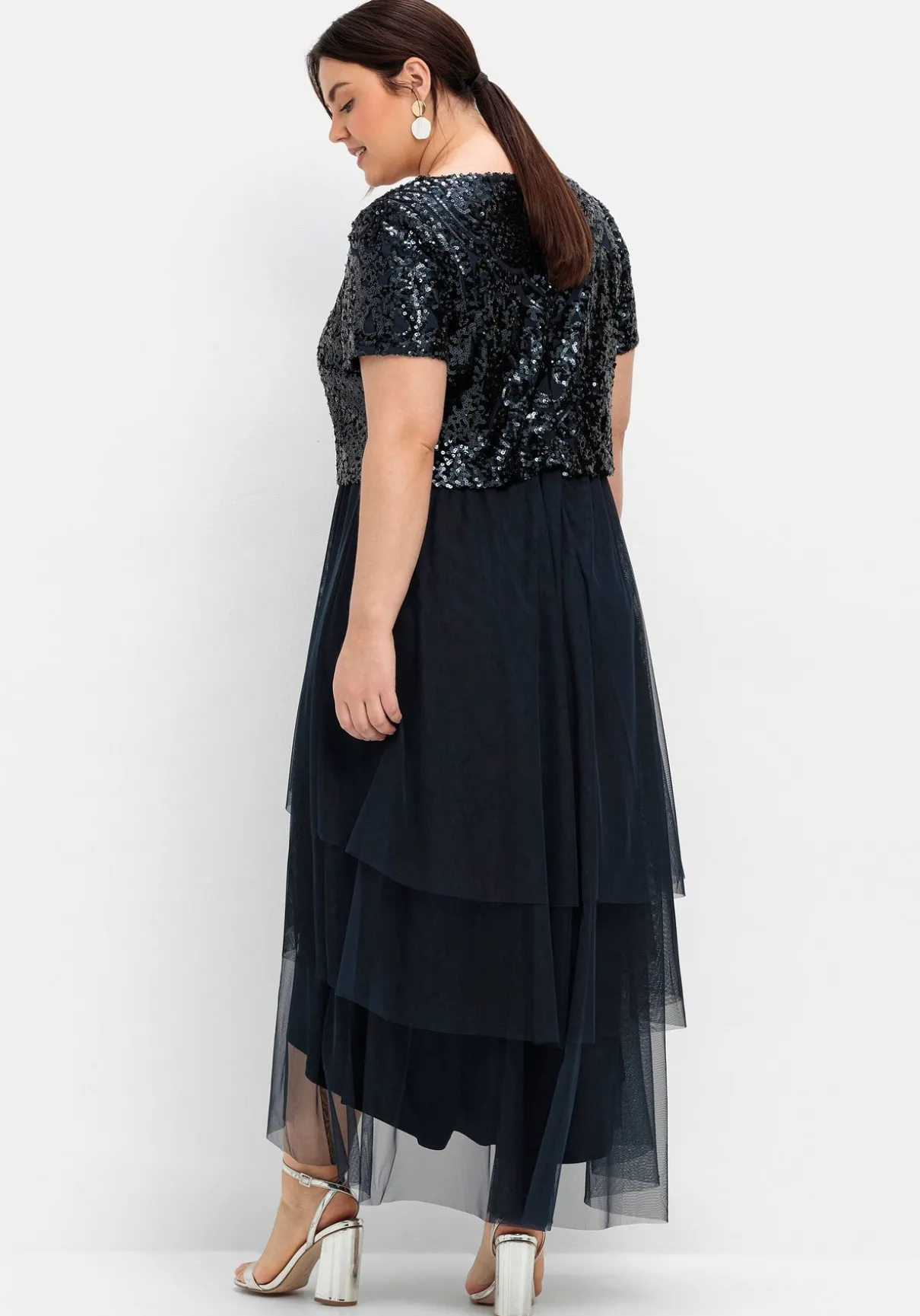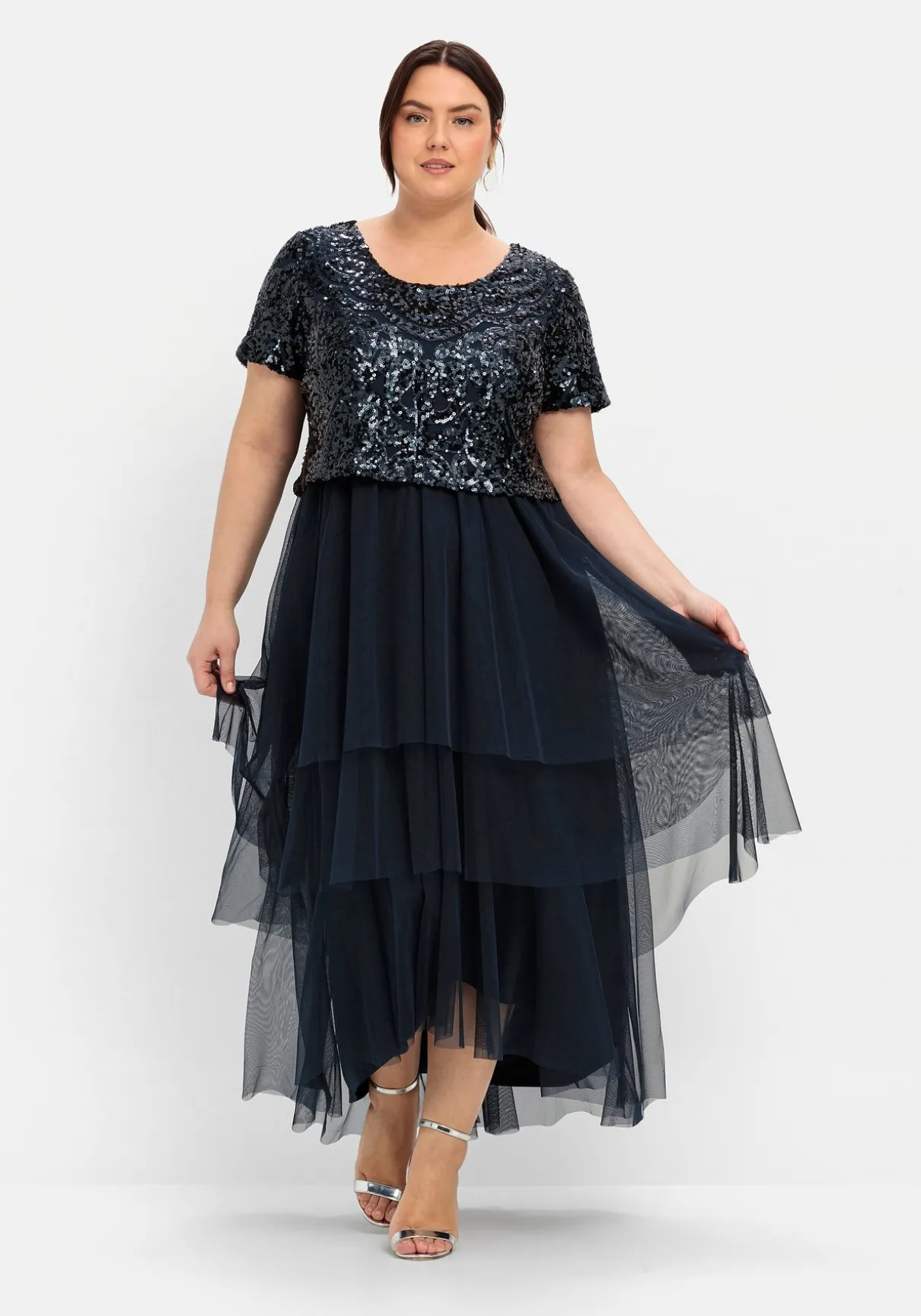Abendkleid in Maxilänge. Besondere Raffinesse erhält das Kleid durch das lose fallende, festlich glitzernde Paillettenoberteil. Daran schließt sich ein transparenter Rock an, der durch die Lagen wunderbar luftig fällt. Hinten besitzt das Kleid einen nahtfeinen Reißverschluss, das Unterkleid macht den Look blickdicht.