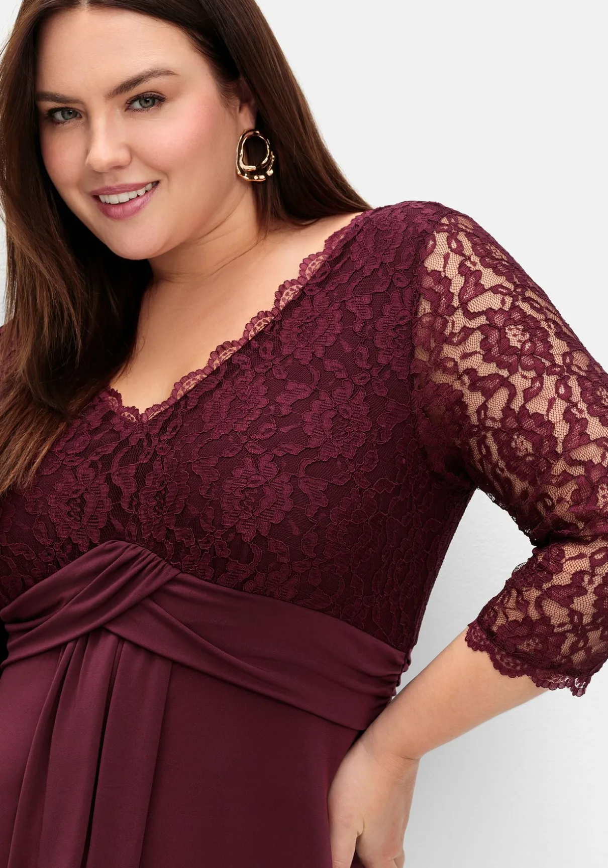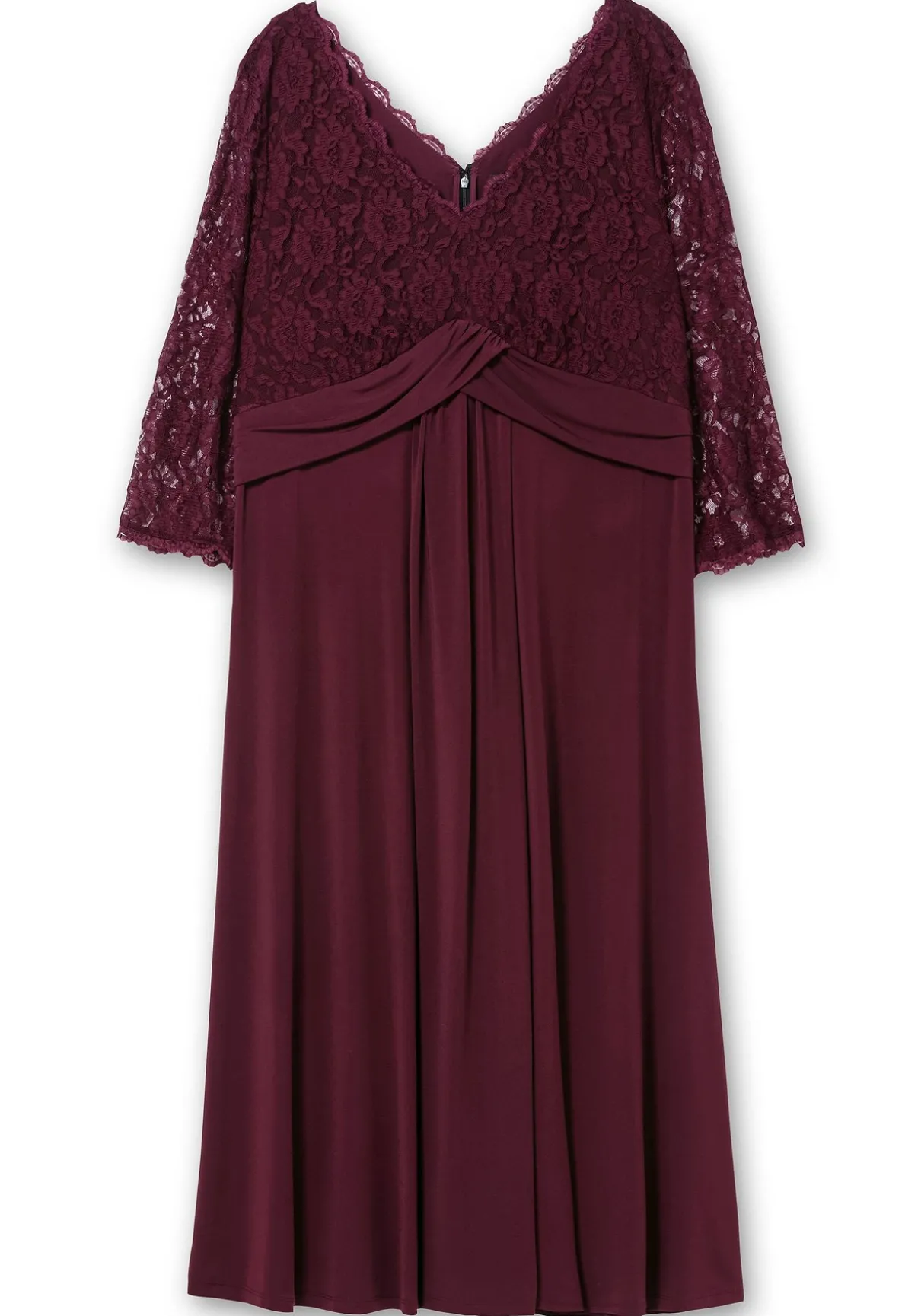 Abendkleid in wadenumspielender Länge. Für Eleganz sorgt die florale Spitze am Oberteil, die an den 3/4-Ärmeln dezent die Haut durchschimmern lässt. Ein tiefer V-Ausschnitt vorn und hinten unterstreicht den femininen Auftritt. Zum Blickfang wird das breite Taillenband mit dekorativem Zierknotendetail, darunter schließt sich ein weit schwingender Rock an. Der nahtfeine Reißverschluss im Rücken ergänzt den festlichen Look.