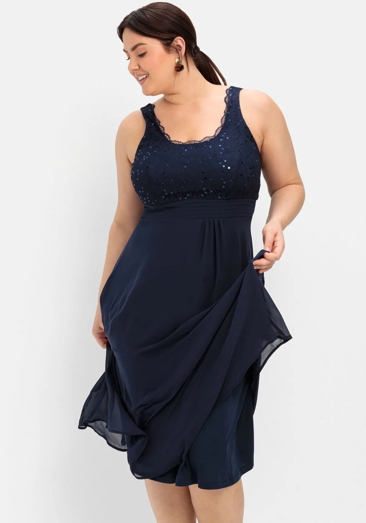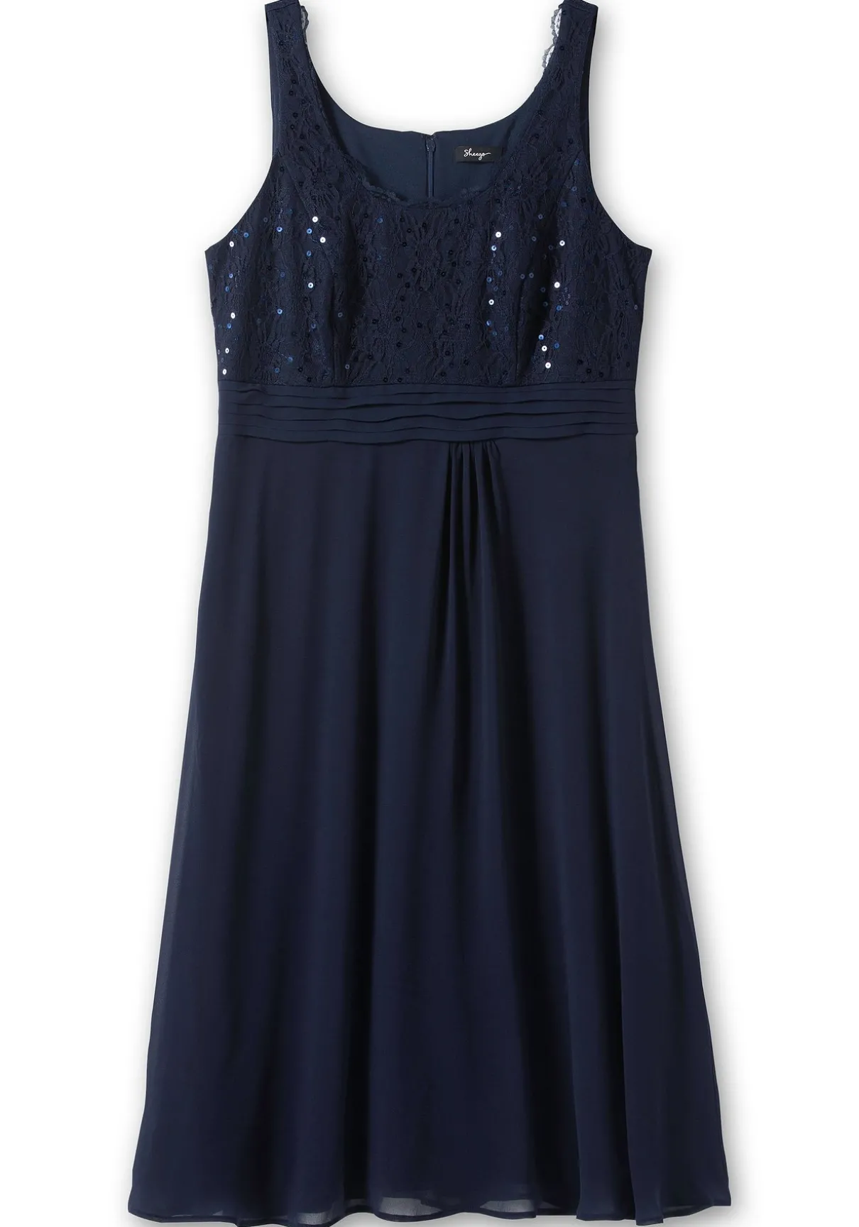 Ein wunderschönes Highlight: Dieses Abendkleid vereint feminine, florale Spitze und fließenden Chiffon. Absoluter Blickfang ist das Spitzenoberteil, das durchweg mit Pailletten besetzt ist. Der Rundhalsausschnitt unterstreicht dabei sanft das Dekolleté. Im Rücken befindet sich ein nahtfeiner Reißverschluss. Der Rock aus fließendem Chiffon sorgt für ein unbeschwertes Gefühl. Mit schmalen Trägern.