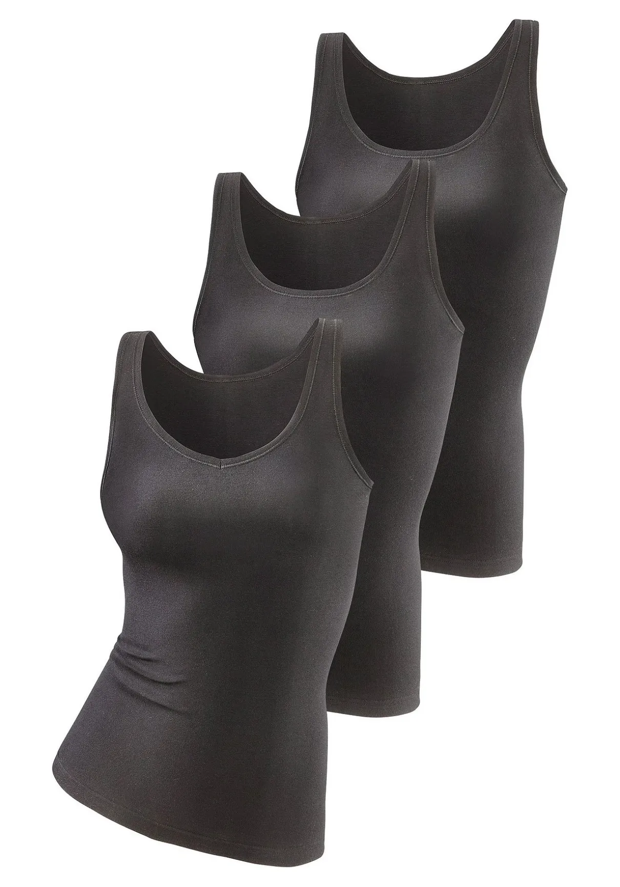 Immer 1x Rundhals-, 1x V-Ausschnitt und 1x Rundhalsausschnitt mit Mäusezähnchen in einer Packung. Länge ca. 66cm. Feinripp aus 100% Baumwolle.