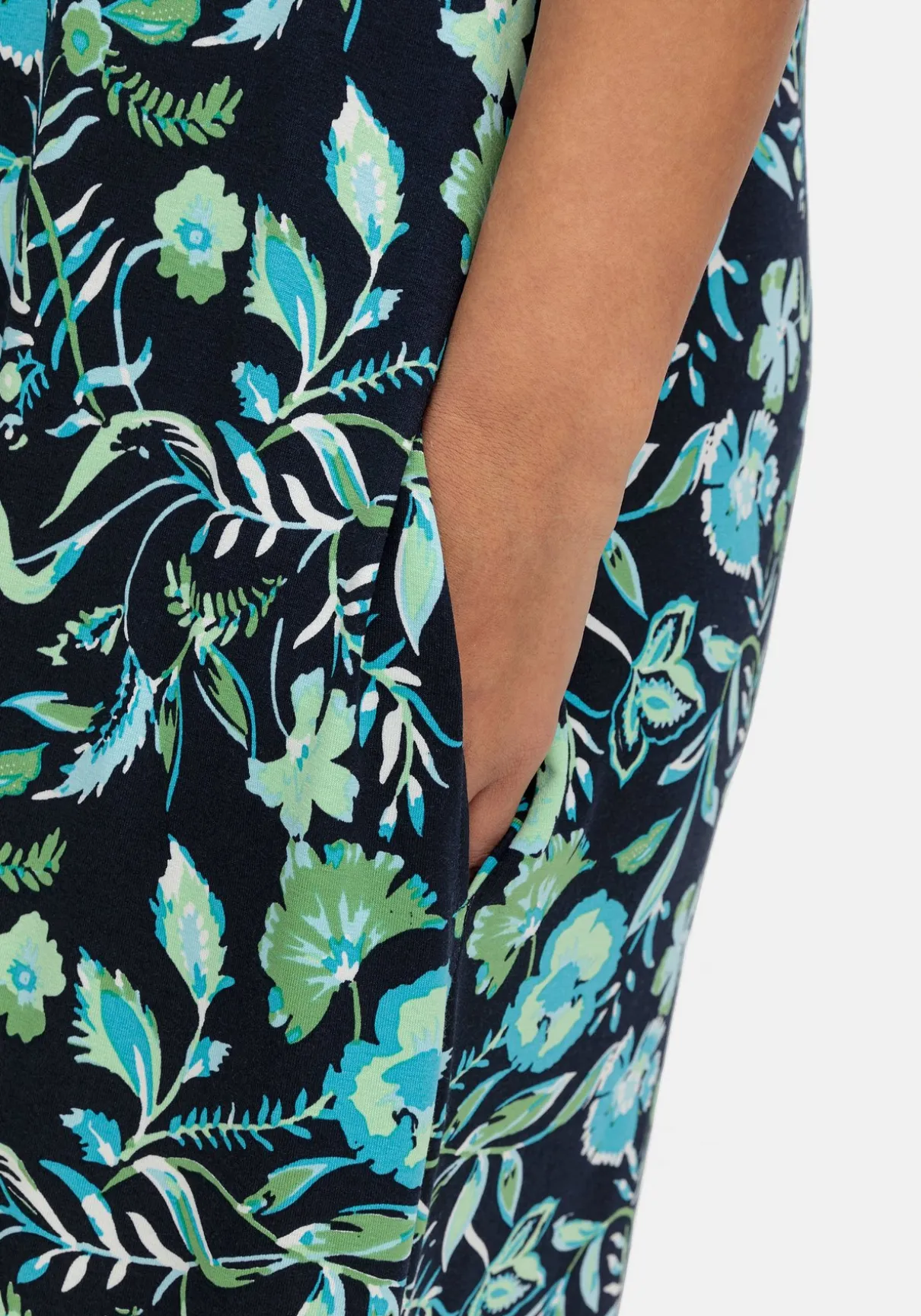 Jerseykleid mit Ornamentprint. Das luftige Kleid ist ärmellos und mit einem gerundeten V-Ausschnitt gearbeitet. Durch den gerundeten Saum mit ca. 20 cm hohen Seitenschlitzen erhält es eine luftig-entspannte Note. Seitliche Taschen machen den Tragekomfort perfekt. Ein idealer Begleiter für Urlaub, Strand und Sommer!