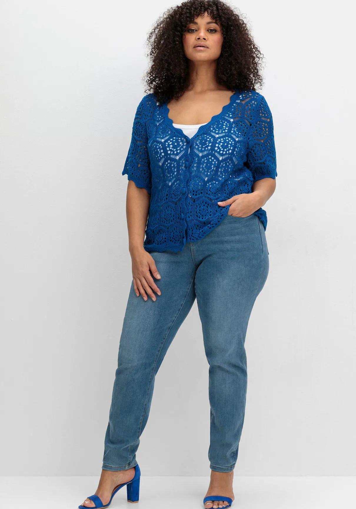 Strickjacke mit kurzem Arm von sheego by Joe Browns. Das zarte, transparente Ajour-Strickmuster wirkt herrlich luftig und wird durch Muschelsaumkanten an allen Abschlüssen feminin ergänzt. Die Jacke hat einen tiefen V-Ausschnitt, stoffüberzogene Knöpfe sind ein hübsches Detail.