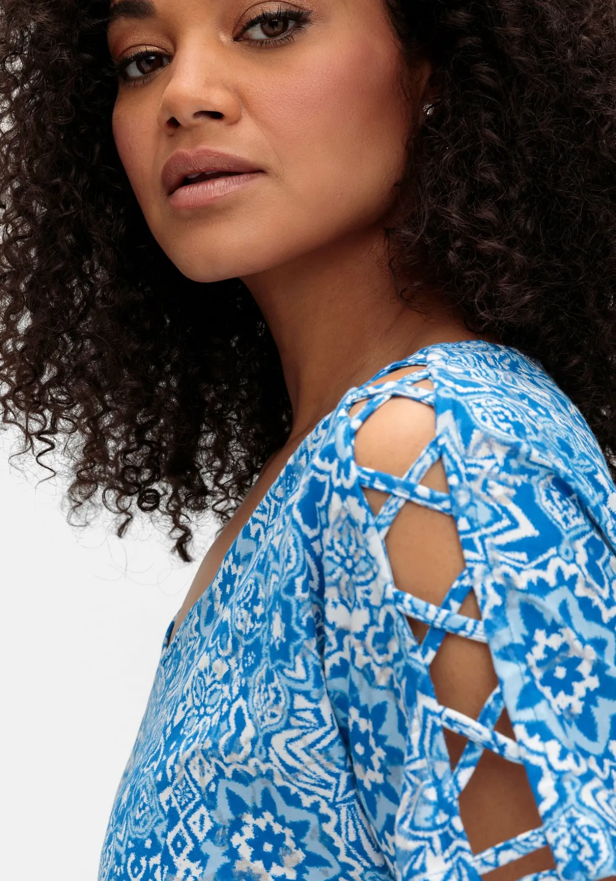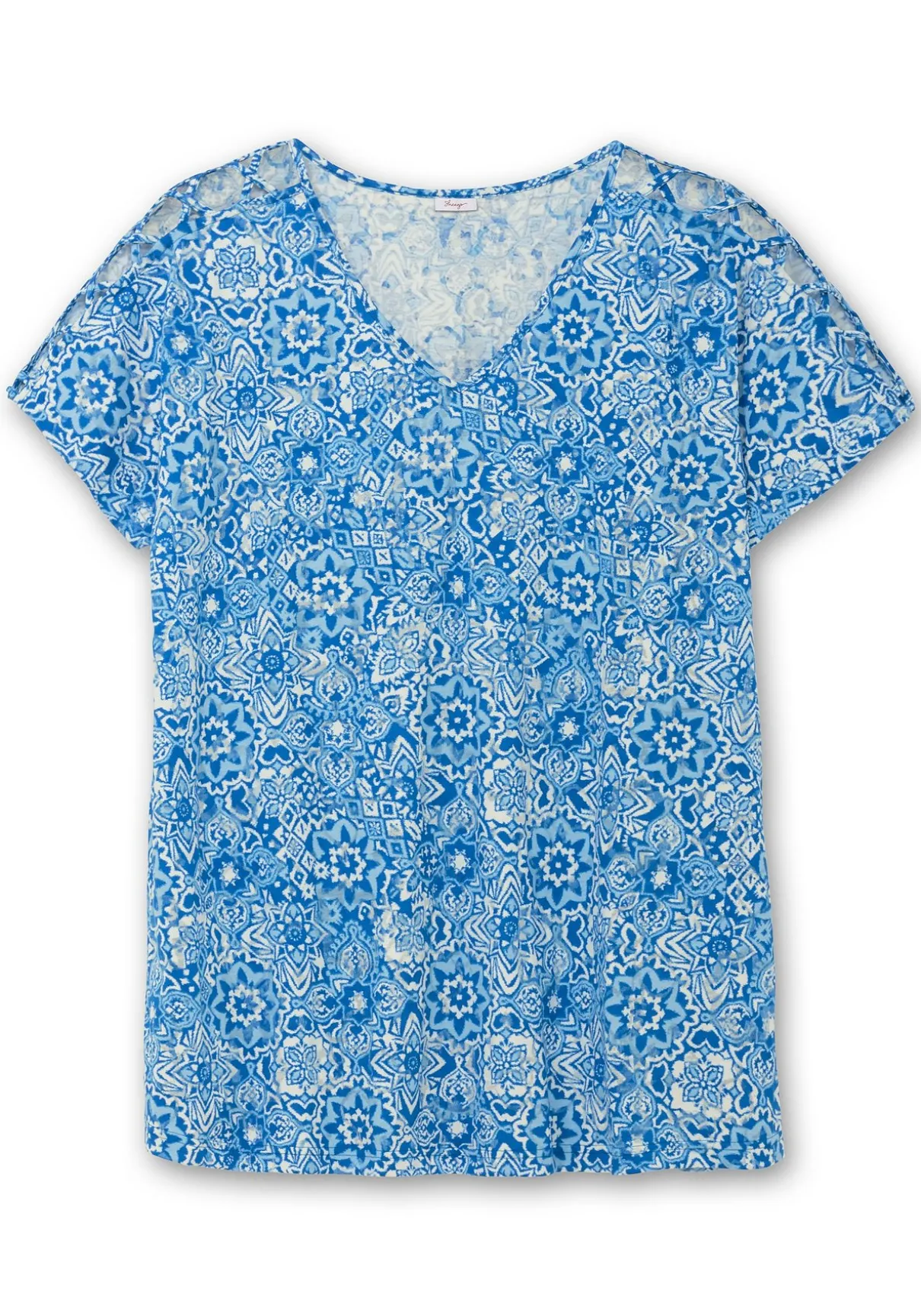 Shirt in A-Linie. Der dekorativer Ornament-Alloverdruck erhält durch den raffinierten Ausbrenner-Effekt seine leicht transparente Optik. Auch die geschlitzten Ärmel wirken sommerlich luftig. Ein streckender V-Ausschnitt und der ausgestellte Schnitt ergänzen den Look.