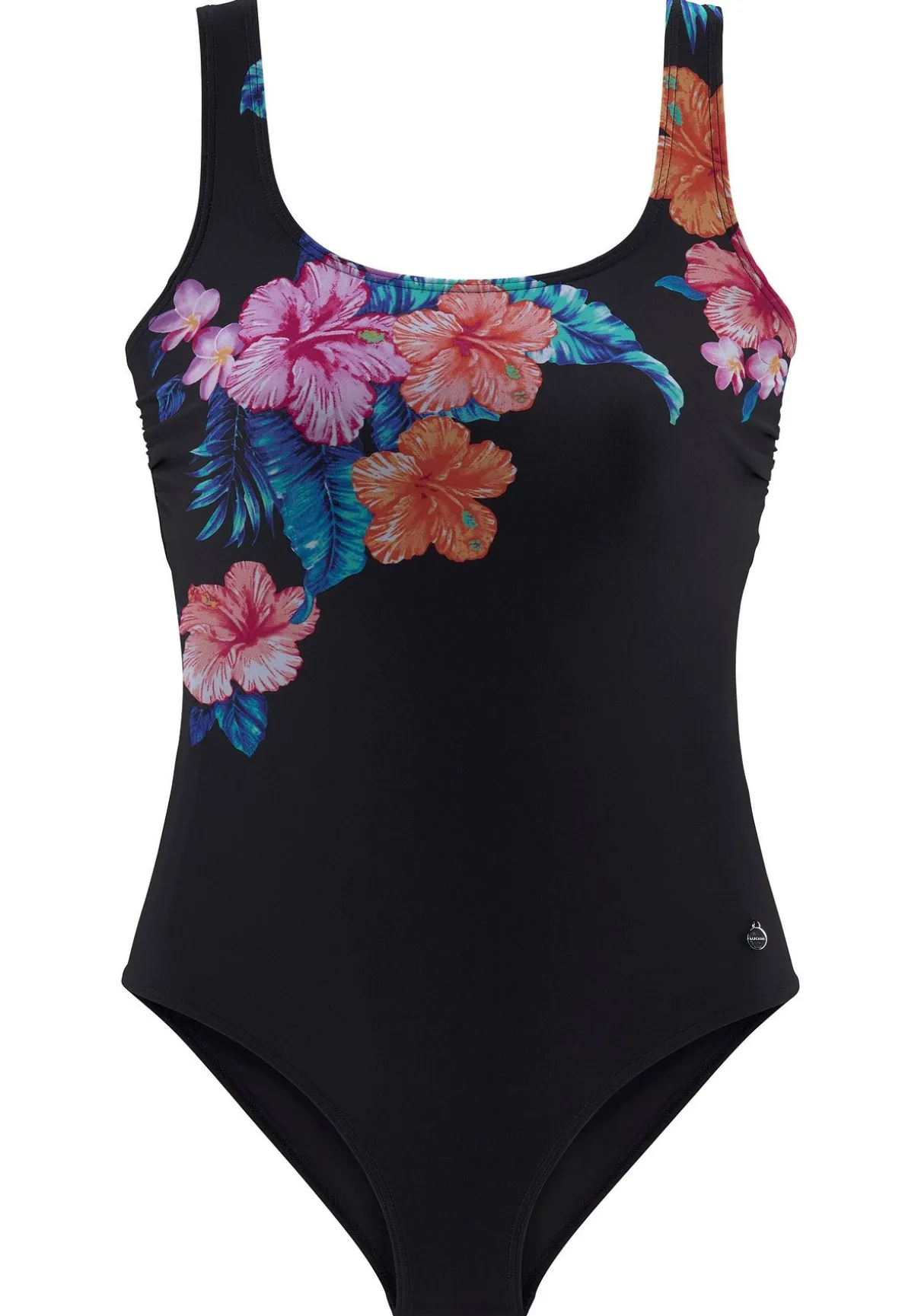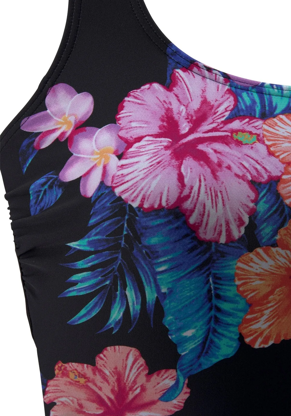 Badeanzug von Lascana mit Blütendruck. Raffiniert gekreuzte Trägergestaltung hinten. Bustier mit integrierten Softcups und Unterbrustgummi. Miederverstärkung. Pflegeleichte, elastische Qualität.