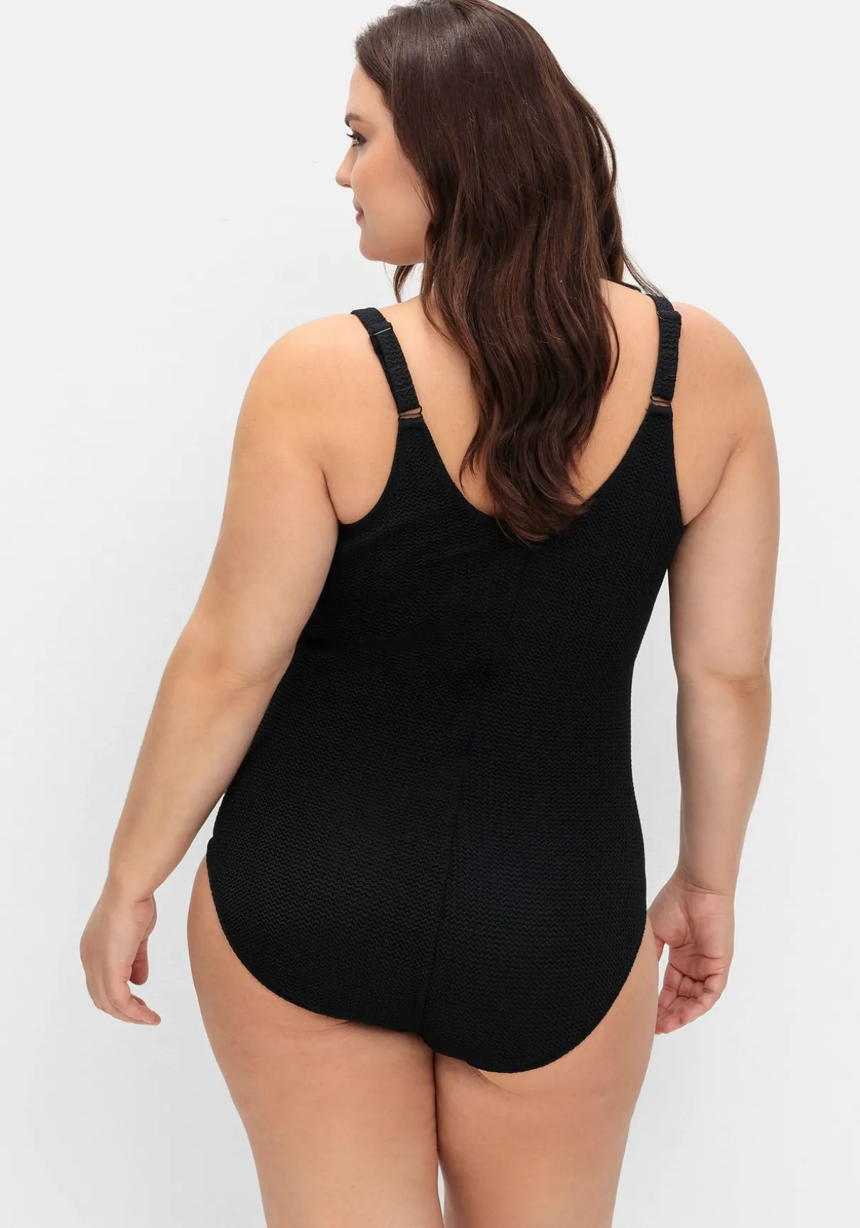 Badeanzug mit starkem Shaping-Effekt. Der zeitlos-schlichte Schnitt erhält durch den strukturierten Stoff den angesagten Retro-Look. Vorgeformte Softcups sorgen für ein schönes Dekolleté, raffiniertes Detail sind der Riegel mit Raffungen. Schmale verstellbare Träger runden den Look harmonisch ab.