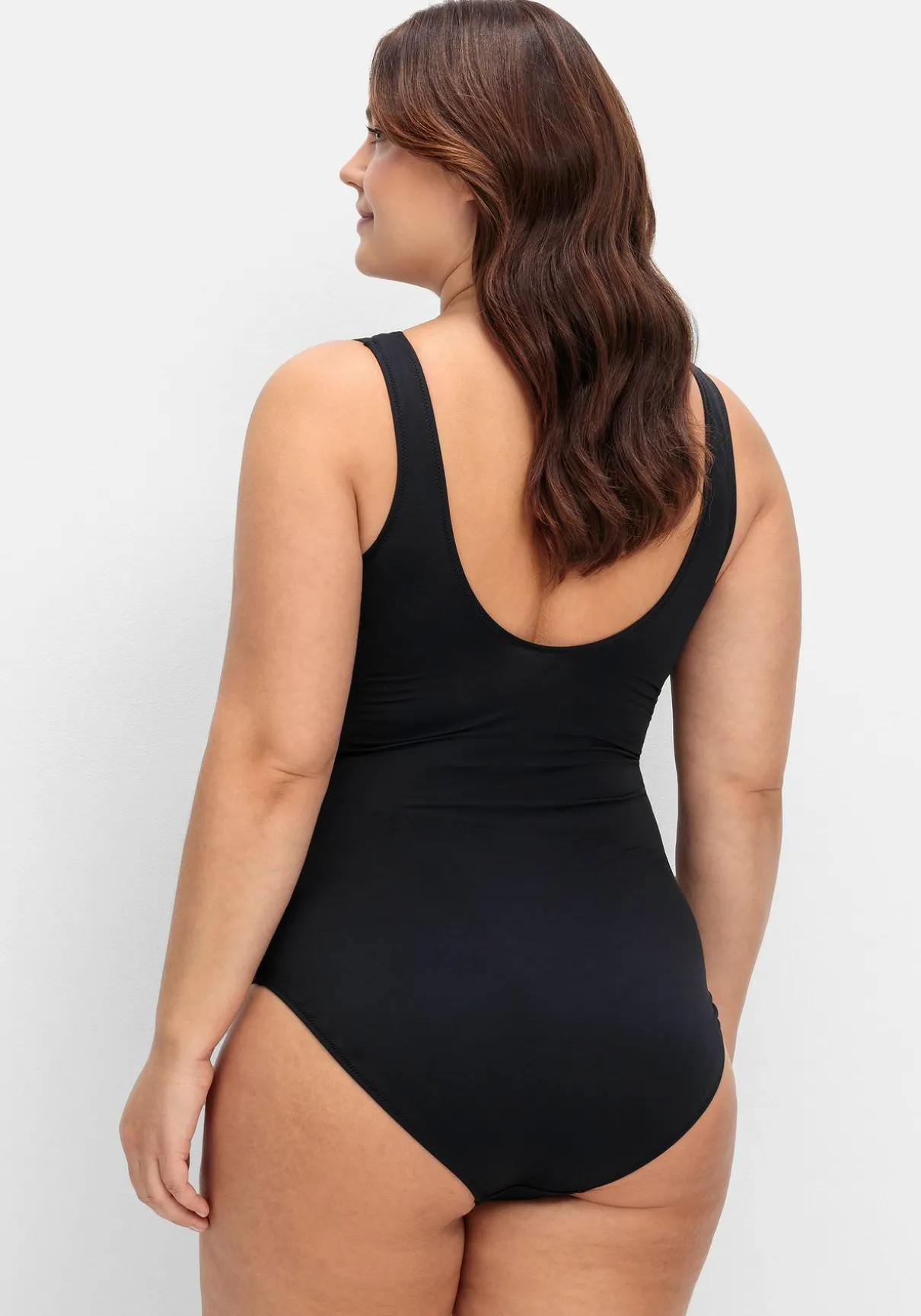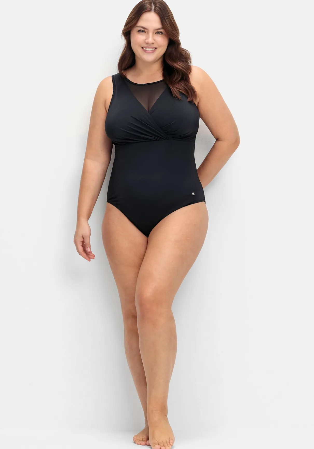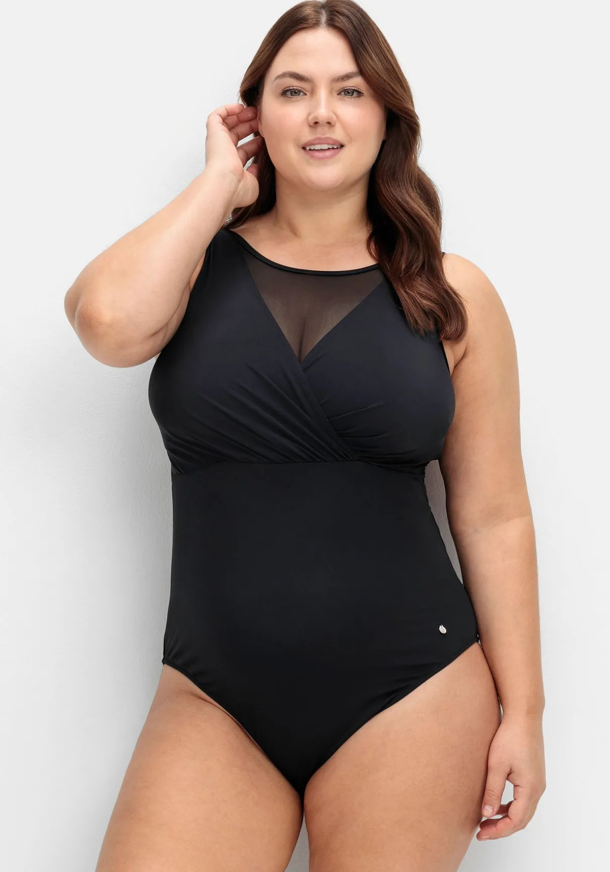 Badeanzug in Wickeloptik. Der raffinierte Schnitt setzt feminine Akzente. So ist der V-Ausschnitt mit einem halbtransparenten Mesh-Einsatz gestaltet und sorgt zusammen mit den wattierten, vorgeformten Cups für ein schönes Dekolleté. Auch der tiefe Rückenausschnitt macht den Badeanzug zum Blickfang. Die bügellose Form sitzt bequem, die breiten Träger bieten zuverlässigen Halt.