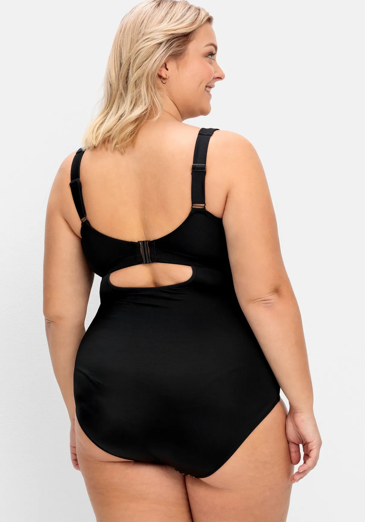 Badeanzug mit Bügeln. Der hohe Rückenausschnitt sorgt für einen sportiven und zugleich femininen Look. Verstellbare Träger machen den Tragekomfort perfekt.