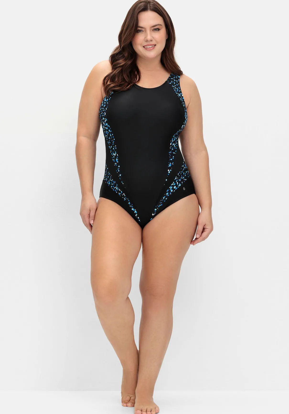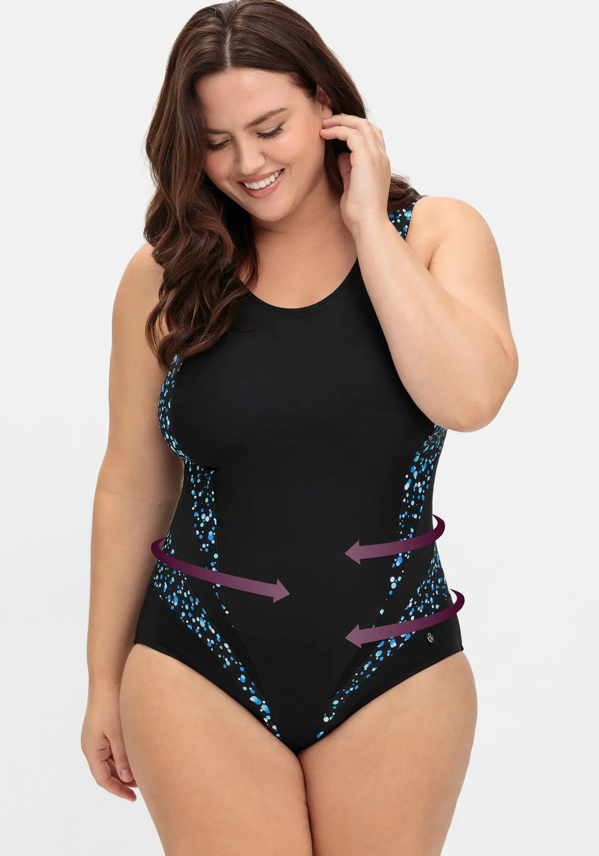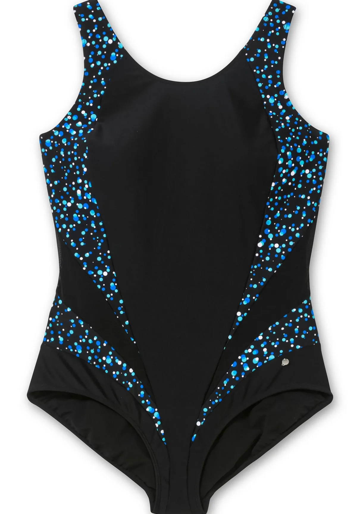 Badeanzug mit starkem Shaping-Effekt. Die unregelmäßig gepunkteten Partien wirken feminin und dynamisch, gleichzeitig strecken sie geschickt die Figur. Raffiniertes Detail ist der Einsatz aus leicht transparentem Mesh. Wattierte Softcups formen ein schönes Dekolleté, das Unterbrustgummi gibt der Brust Halt. Breite verstellbare Träger runden den Look ab.