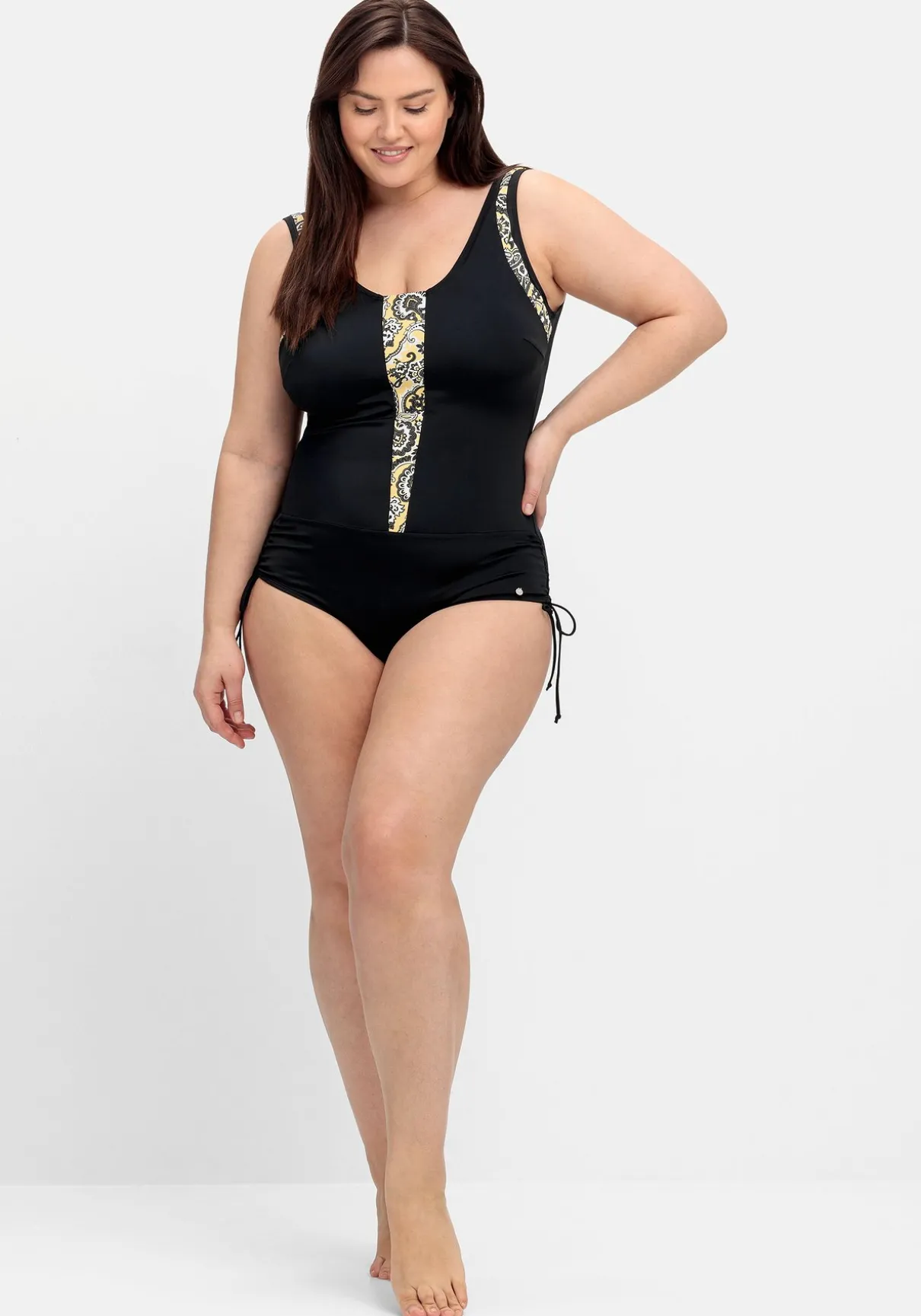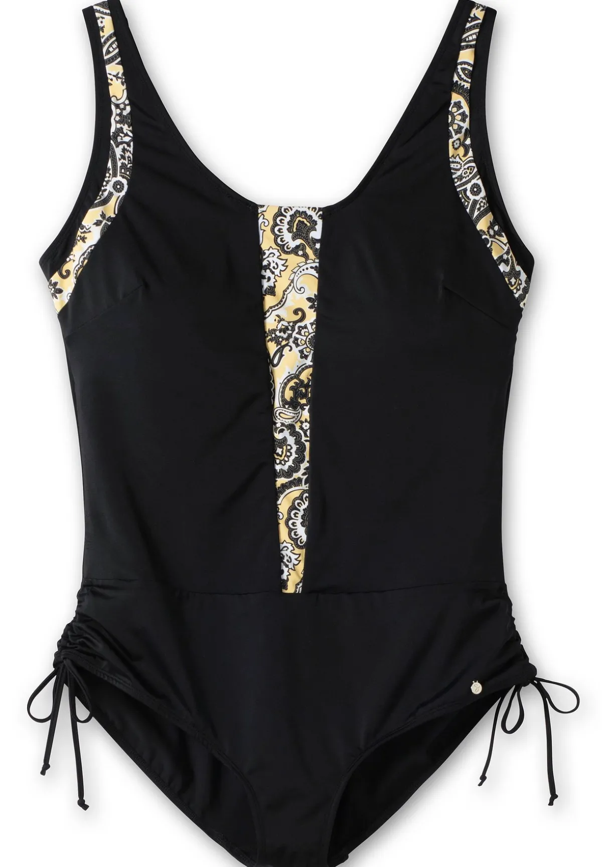 Badeanzug mit seitlichen, raffbaren Bändchen. Auch der keilförmige Einsatz im Paisleymuster vorn unterstreicht den besonderen Look. Wattierte Softcups und ein Unterbrustgummi geben der Brust Form, breite Träger machen den Tragekomfort perfekt. Abgerundet wird der Look durch ein kleines Metalllabel vorn.