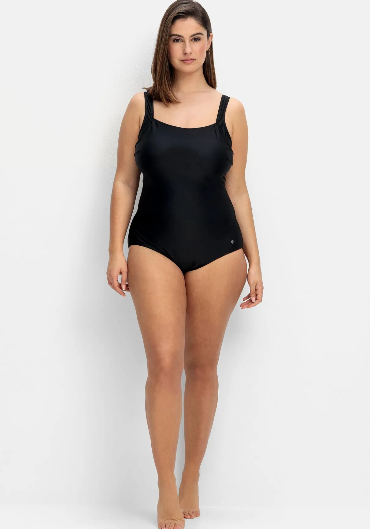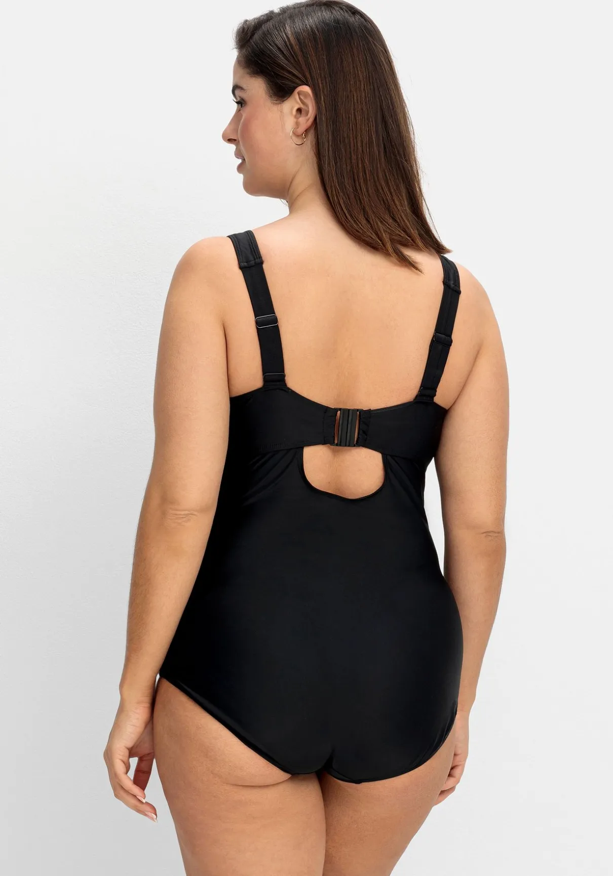 Badeanzug mit tiefem Rückenausschnitt. Die eingearbeitete Schließe dient als Eyecatcher und sorgt gleichzeitig für optimalen Halt. Ansonsten zeigt sich der Badeanzug im schlichten, puren Look. Wattierte Softcups und ein Unterbrustgummi geben der Brust Form, breite verstellbare Träger machen den Tragekomfort perfekt.