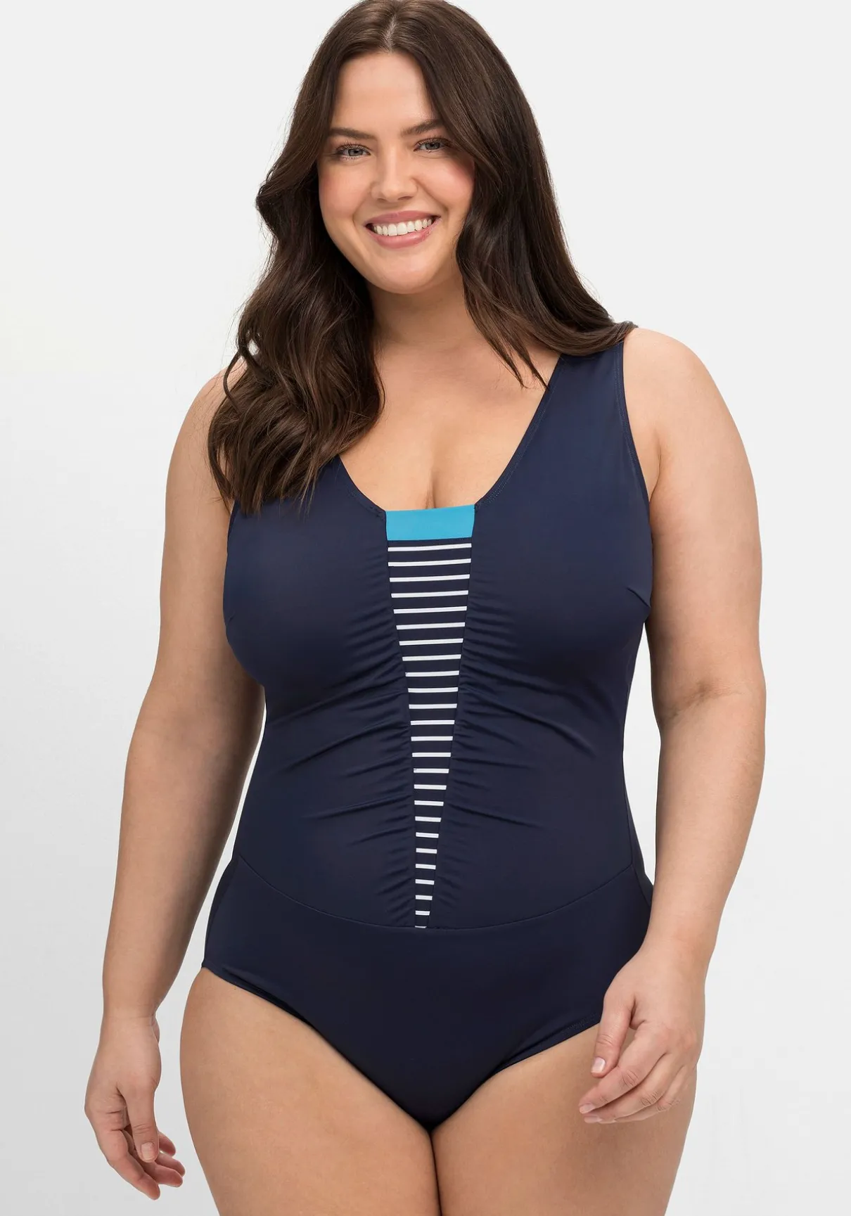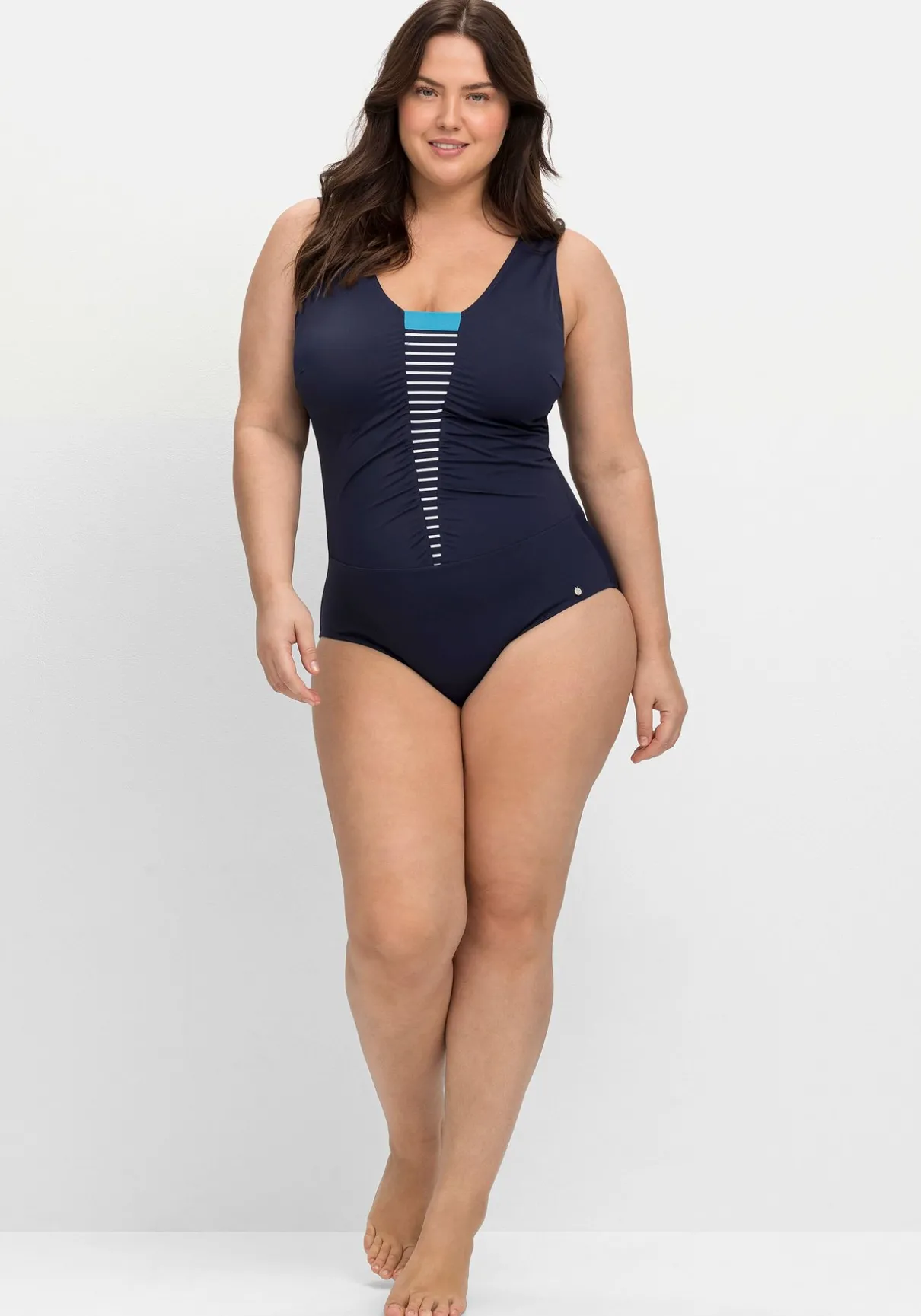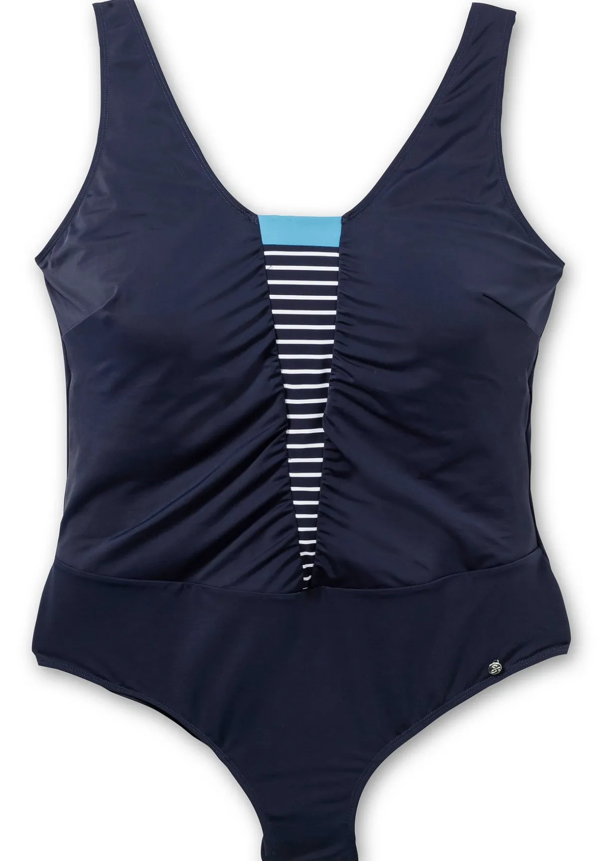 Badeanzug mit Shaping-Effekt. Der zeitlose Style erhält durch die Raffung und den gestreiften Kontrasteinsatz einen besonderen Look. Wattierte Softcups und ein Unterbrustgummi geben der Brust Form, breite verstellbare Träger machen den Tragekomfort perfekt.