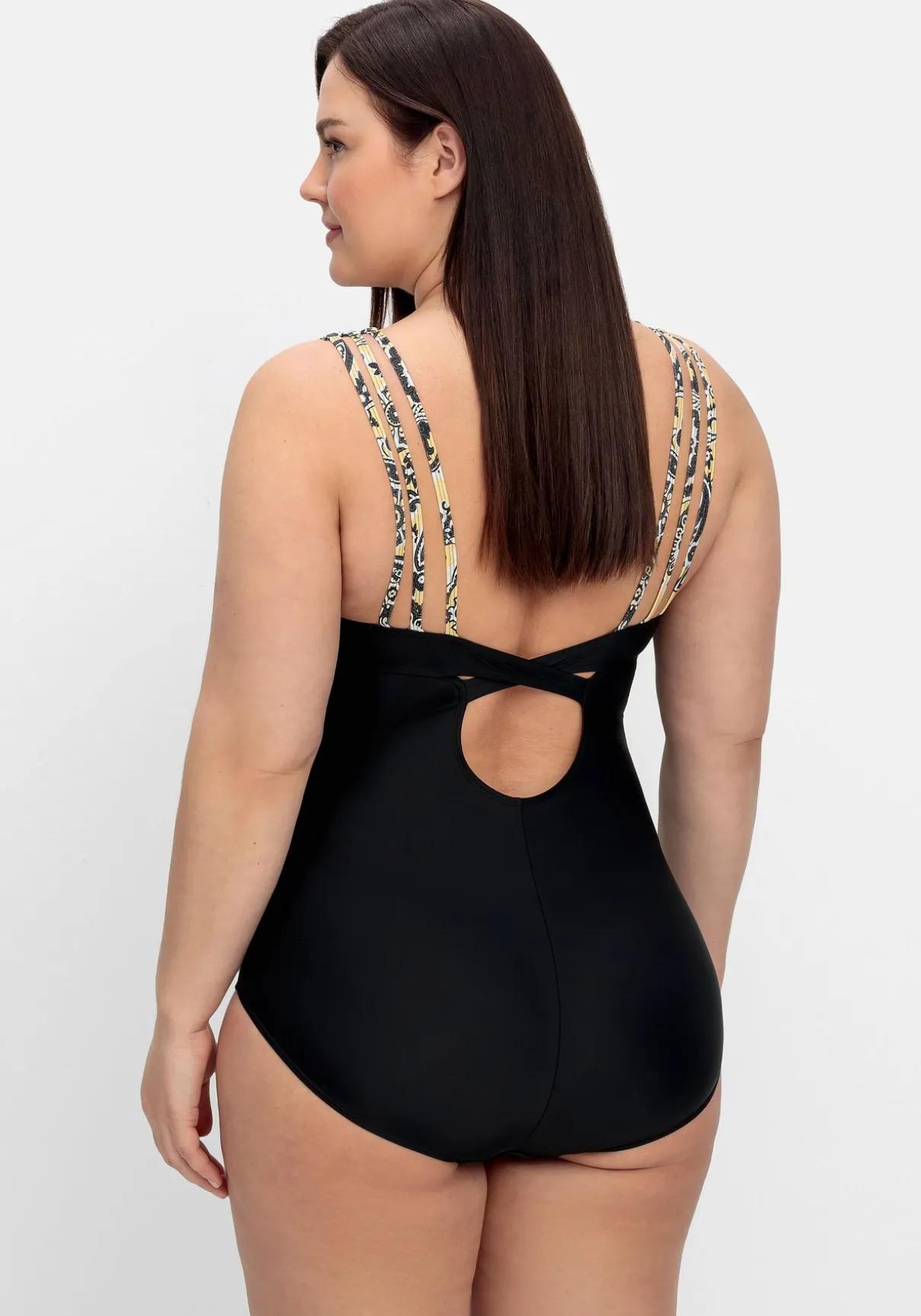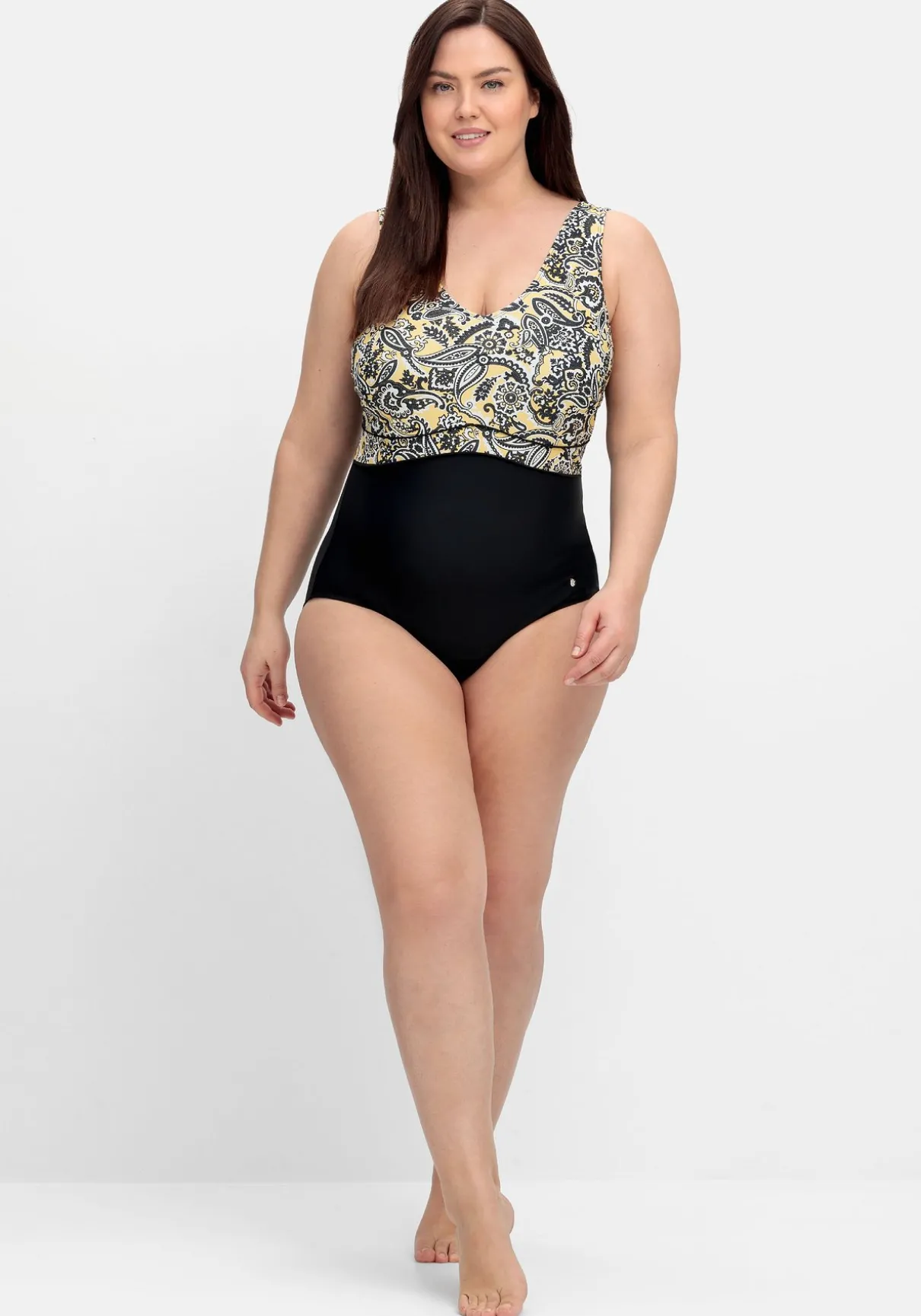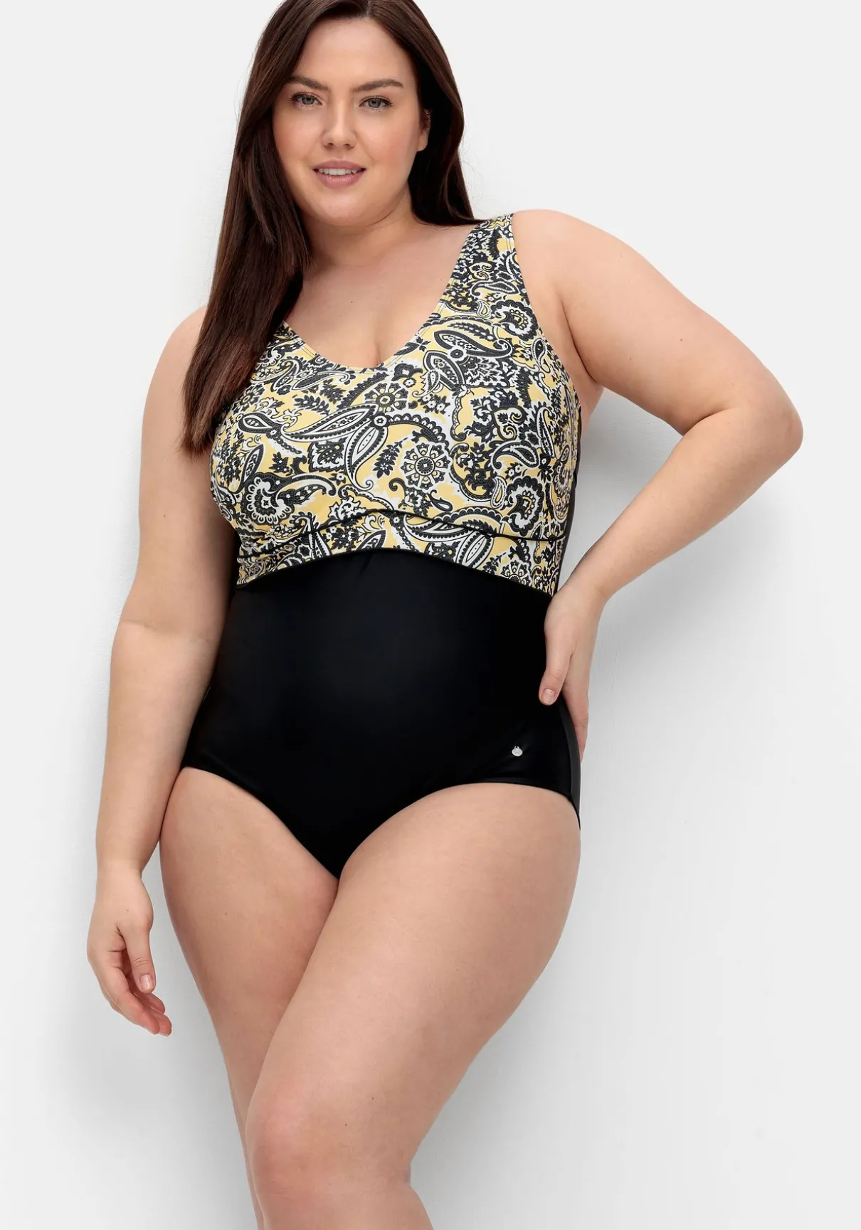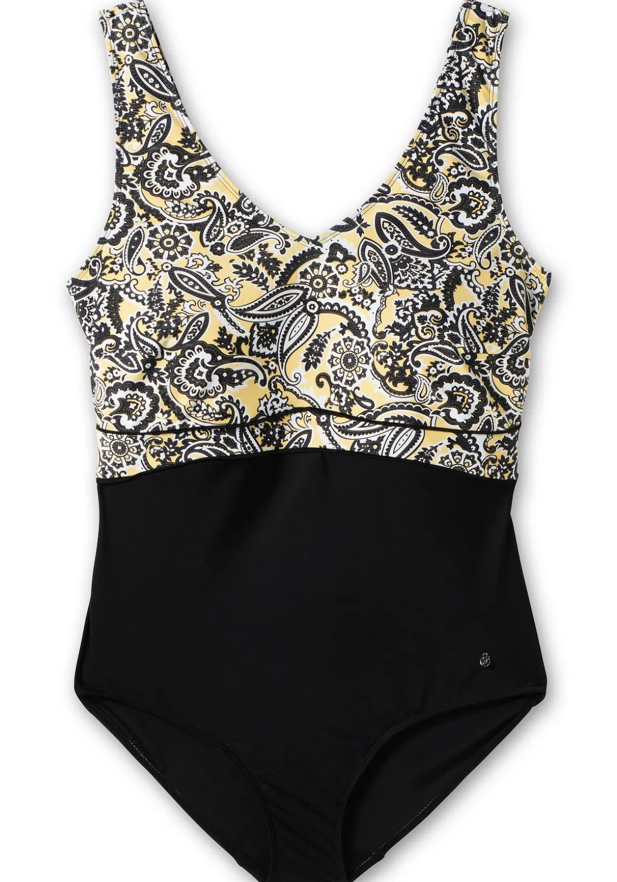 Badeanzug mit tief ausgeschnittenem Rücken. Das dekorative Paisleymuster lenkt den Blick nach oben, das Höschen ist dagegen schlicht unifarben gehalten. Die Träger garantieren vorn optimalen Halt, im Rücken werden sie zu drei schmalen Bändern und damit zum raffinierten Eyecatcher. Die wattierten Softcups geben der Brust Form.