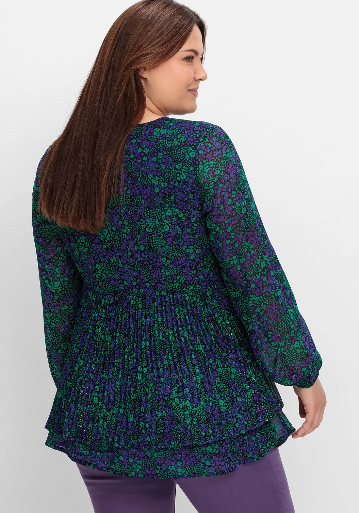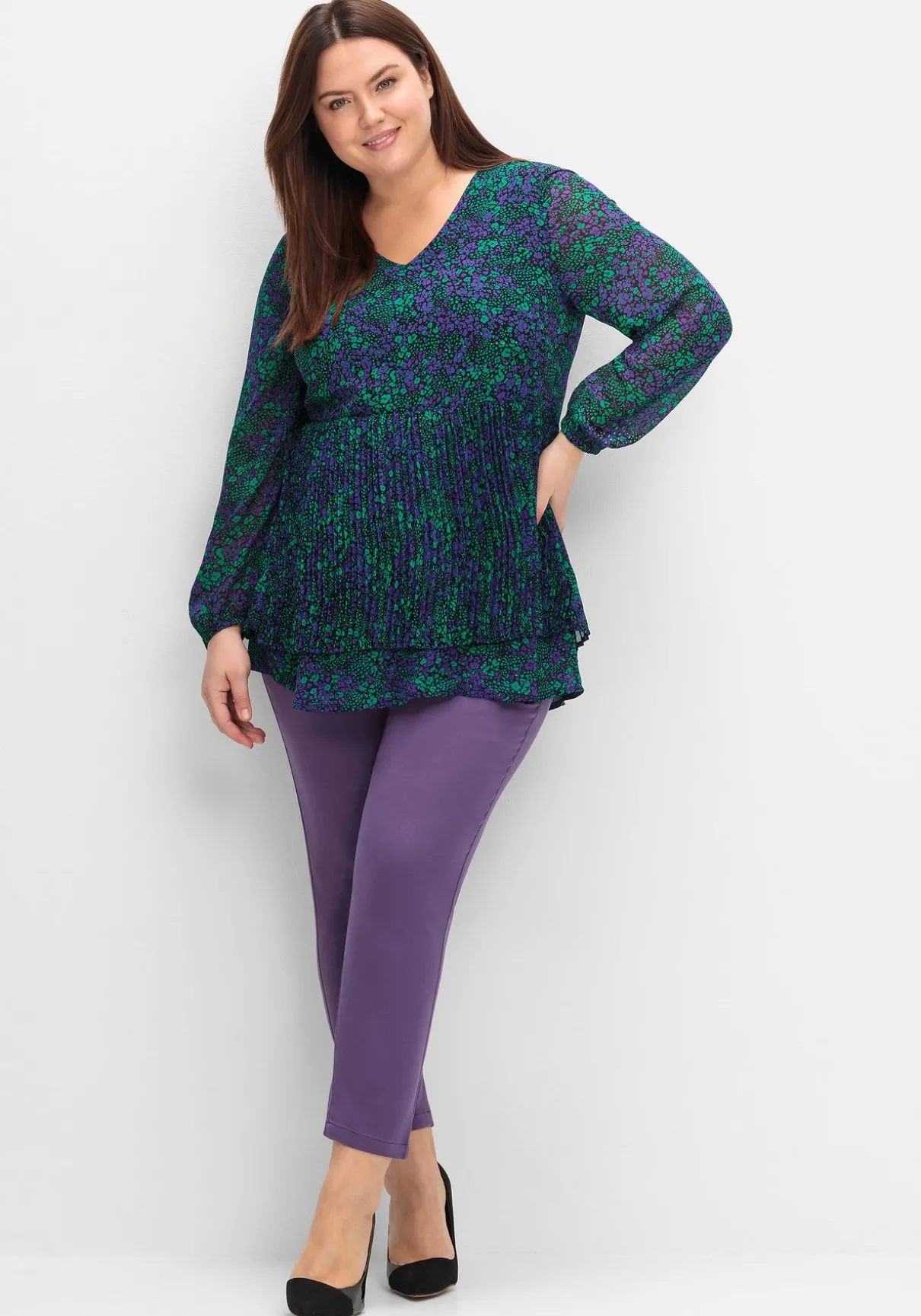 Chiffontunika von sheego by Joe Browns. Der Minimal-Blümchendruck kommt auf dem zarten, fließenden Chiffon schön zur Geltung. Die doppellagige Verarbeitung mit Plisseefalten unterhalb der Teilungsnaht unterstreicht den femininen Look. Die semitransparenten Ärmel enden mit elastischen Bündchen und lassen dezent die Haut durchschimmern, der obere Teil der Tunika ist blickdicht gefüttert.