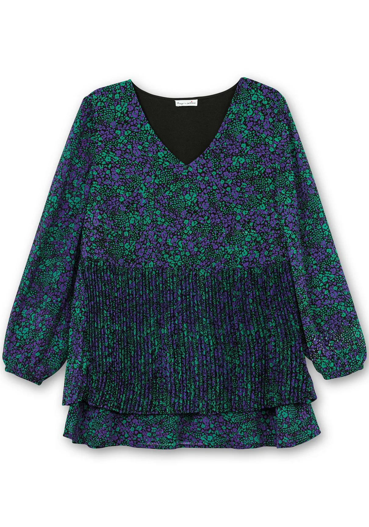 Durch den doppellagigen Schnitt mit Plisseefalten umspielt die Tunika schmeichelnd die Hüftpartie. Der V-Ausschnitt streckt optisch den Oberkörper.