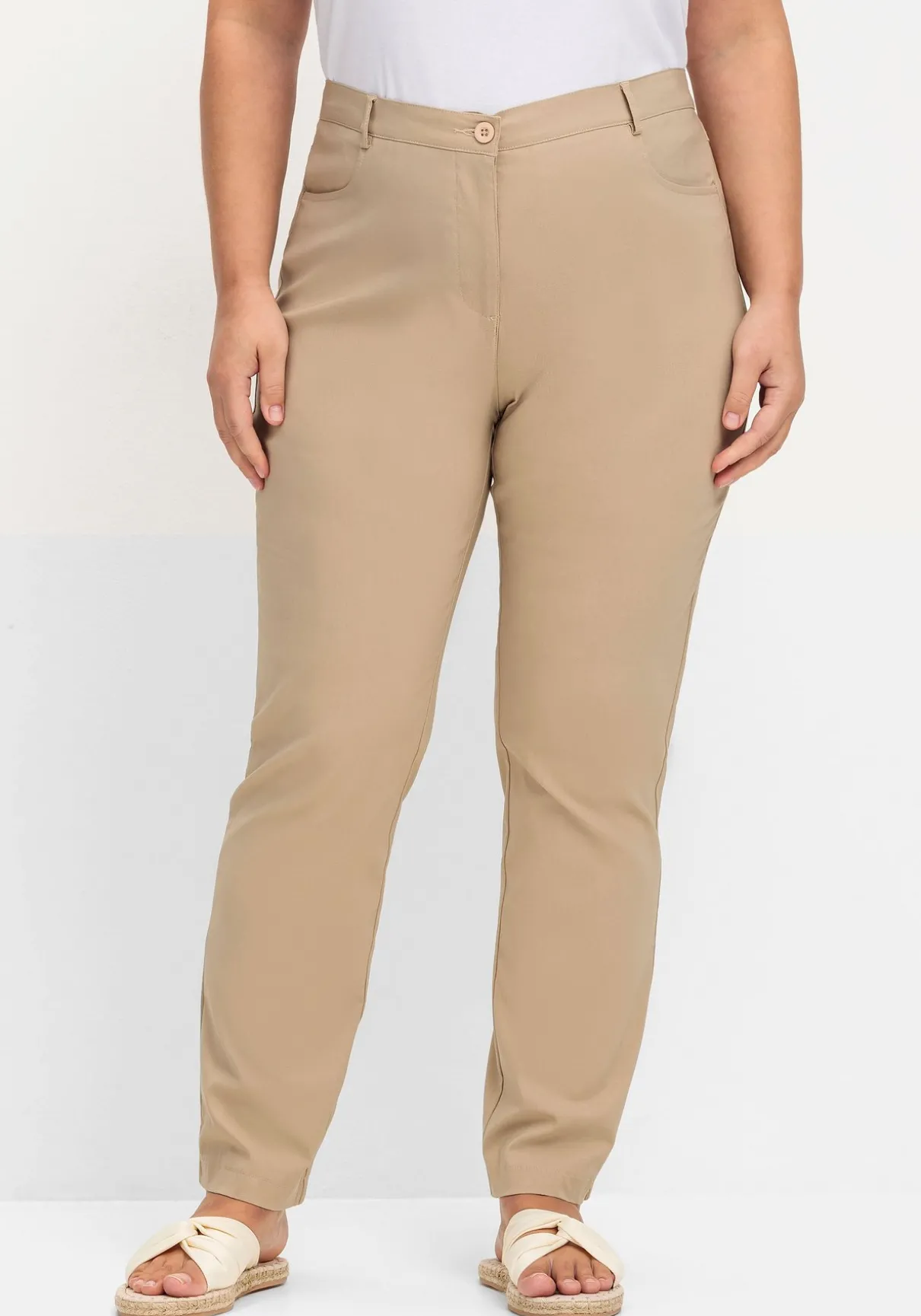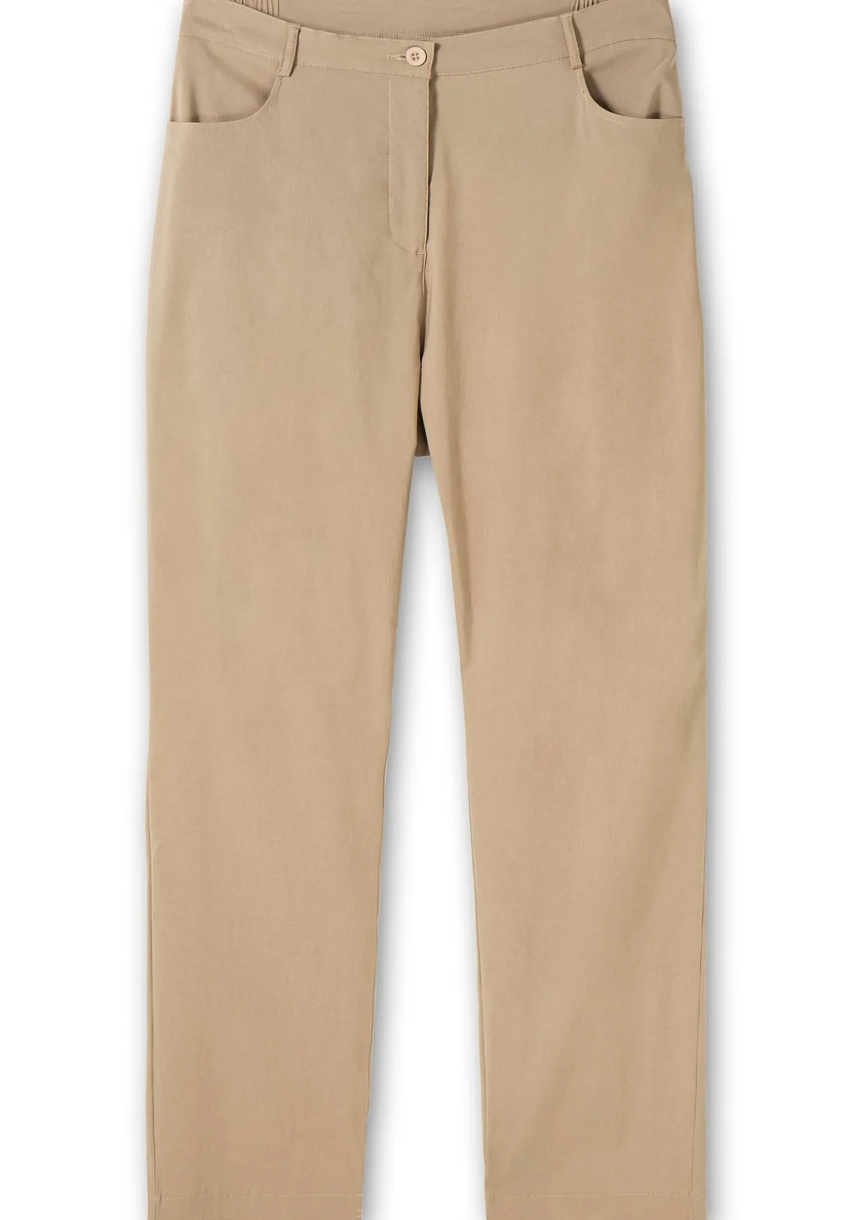 Hose in gepflegter Bengalin-Qualität. Durch die elastischen Einsätze seitlich am Bund sitzt sie besonders bequem. Dazu kommen Gürtelschlaufen, Knopf und Reißverschluss. Vorn hat die Hose zwei Eingrifftaschen, die Taschen hinten zieren Schmetterlingsstickereien und Nieten.