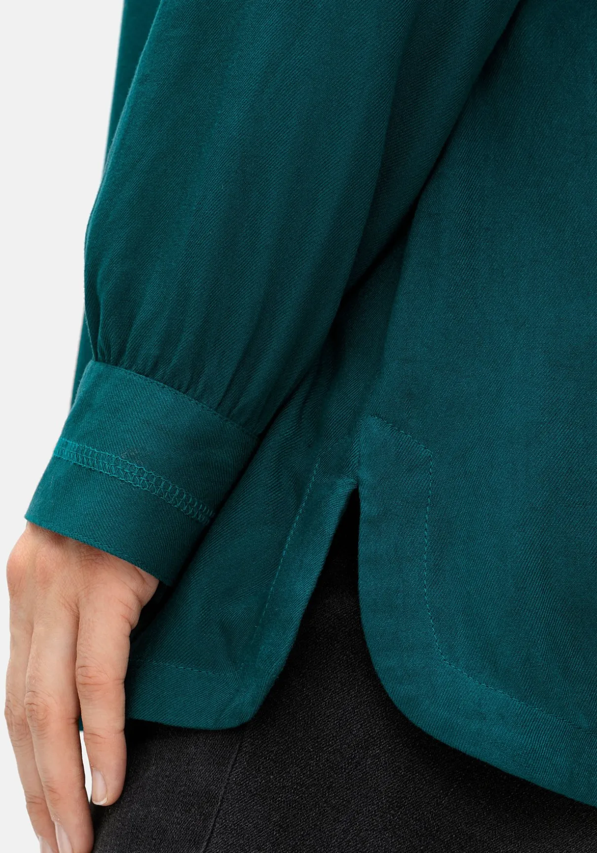 Die Twillqualität besteht aus reiner Viskose und fällt weich fließend über die Silhouette.