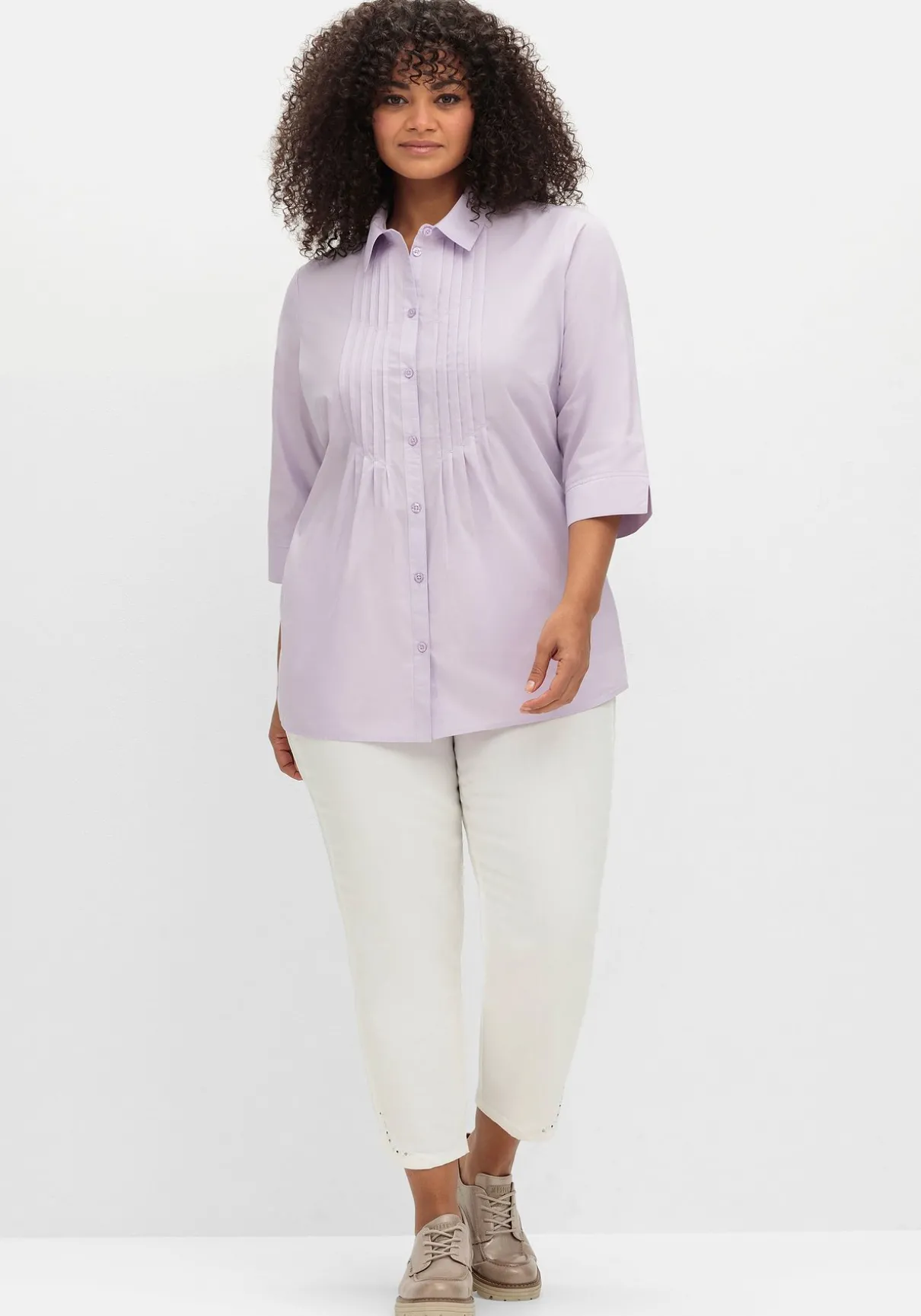 Hemdbluse mit 3/4-Ärmeln. Dekorative Biesen entlang der Knopfleiste verleihen der Bluse eine verspielte Optik und strecken gleichzeitig geschickt die Silhouette. Die Ärmel sind mit geschlitzten Manschetten gearbeitet, ein klassischer Blusenkragen ergänzt den feminin-gepflegten Look.