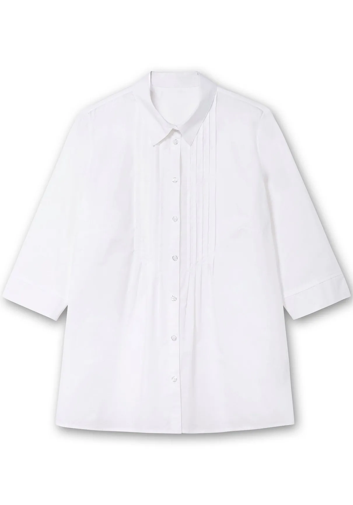 Hemdbluse mit 3/4-Ärmeln. Dekorative Biesen entlang der Knopfleiste verleihen der Bluse eine verspielte Optik und strecken gleichzeitig geschickt die Silhouette. Die Ärmel sind mit geschlitzten Manschetten gearbeitet, ein klassischer Blusenkragen ergänzt den feminin-gepflegten Look.