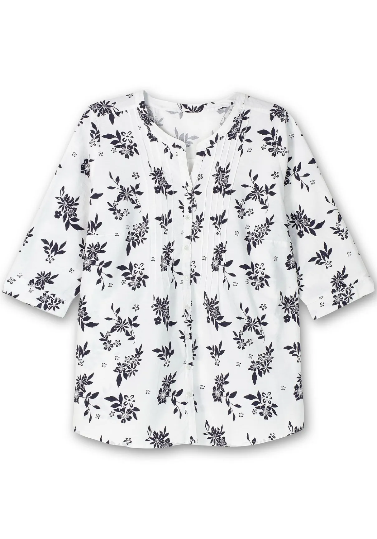 Bluse mit dekorativen Biesen. Das filigrane Blumenmuster verleiht der Bluse sommerliche Leichtigkeit. Dazu sind die luftigen 3/4-Ärmel eine harmonische Ergänzung. Beidseitig der durchgehenden Knopfleiste eingearbeitete Biesen springen zum Saum hin auf und geben dem Fit bequeme Weite. Der Rundhalsausschnitt ist mit einer Blende gearbeitet und geht in einen kurzen V-Schlitz über. Brustabnäher formen die Silhouette, hinten sorgt die Schulterpasse für einen guten Sitz. Der leicht abgerundete Saum lässt die Bluse schön über die Hüfte fallen.