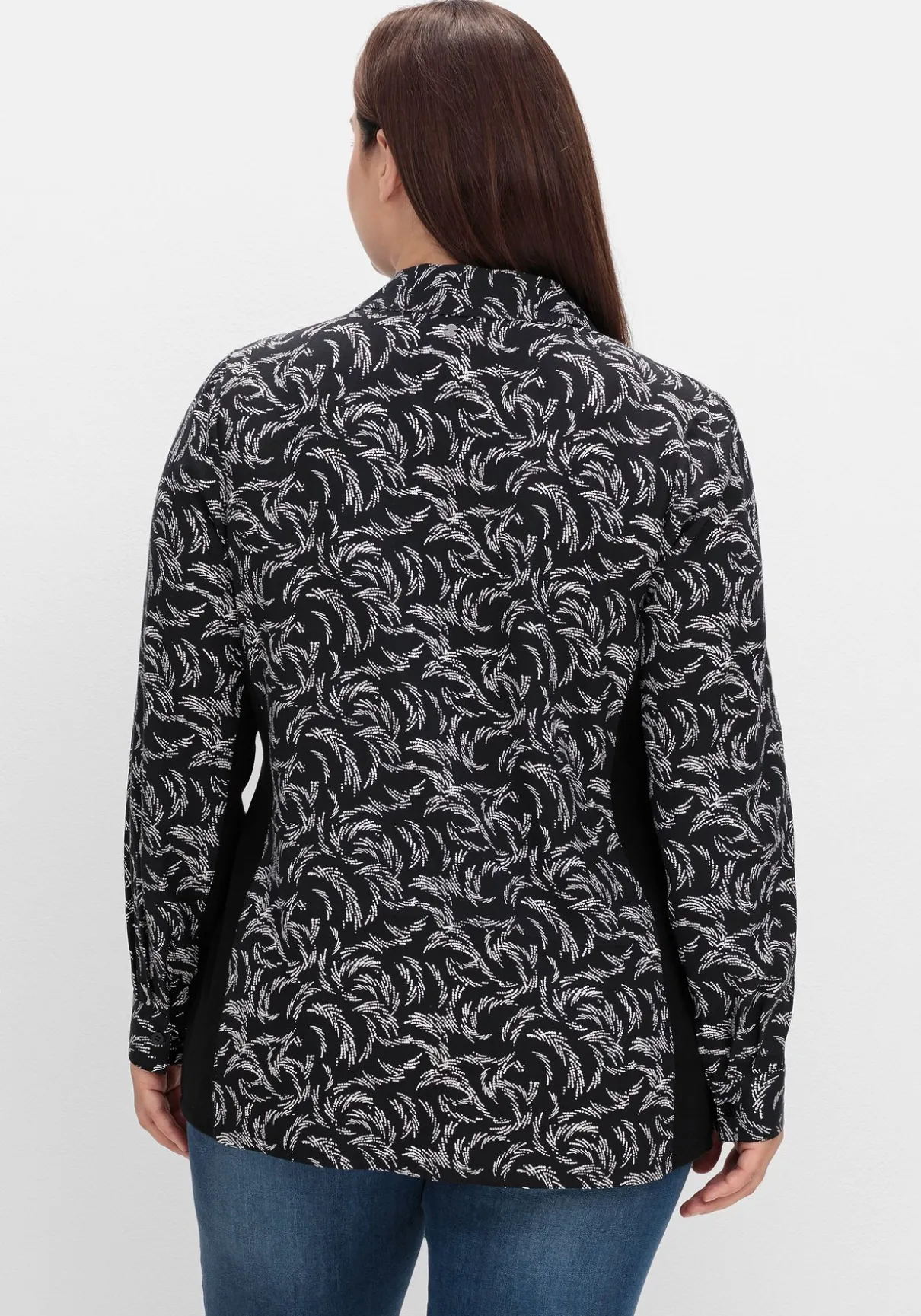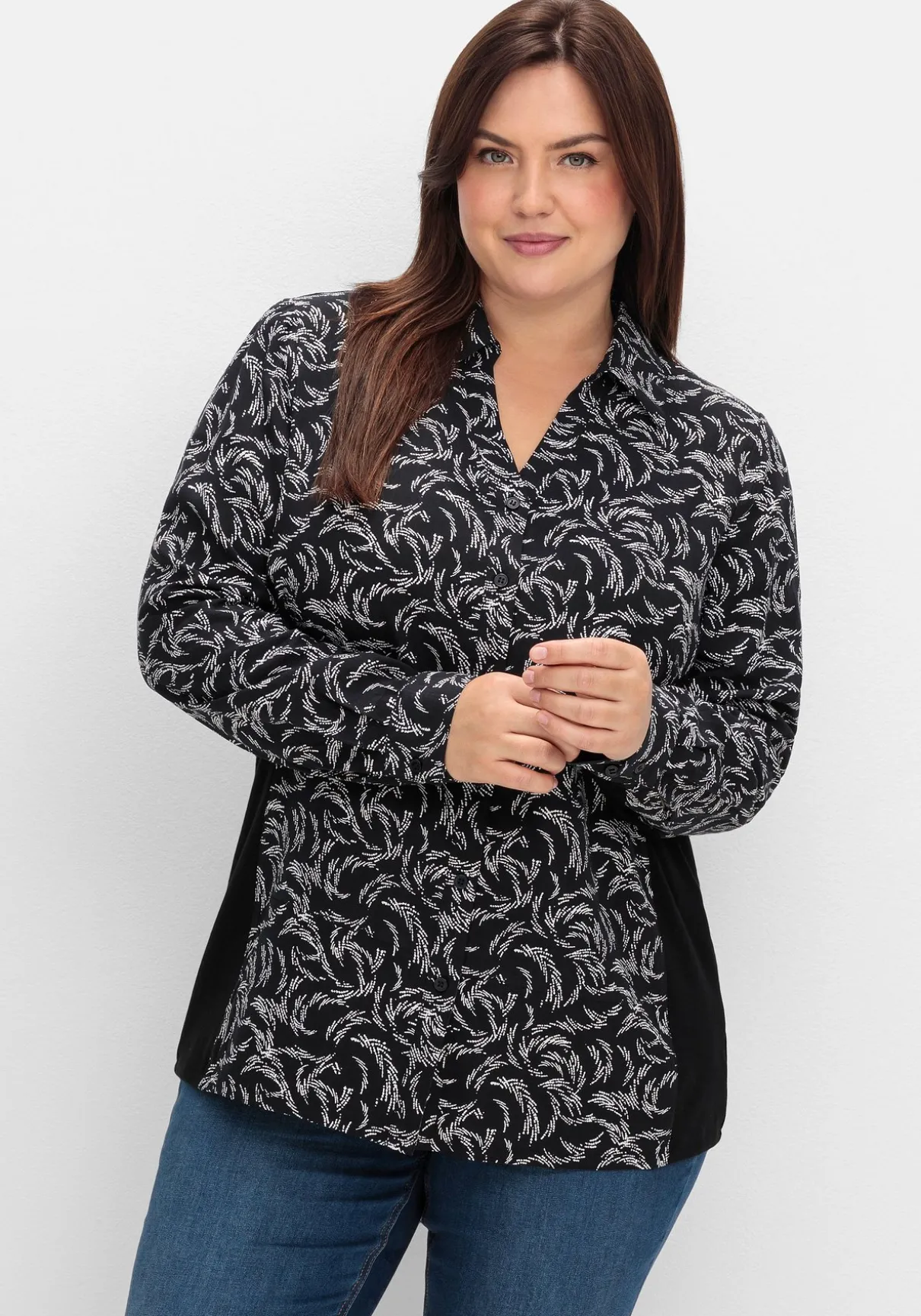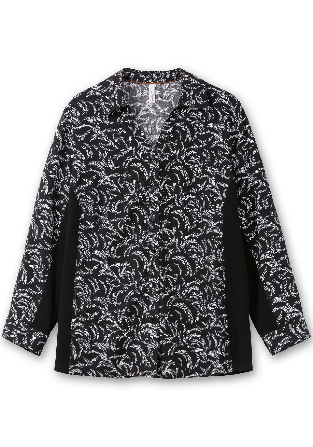 Bluse mit Alloverdruck. Zum filigranen Minimalprint setzen die unifarbenen Einsätze am Ärmel und in den Seiten einen spannenden Kontrast. Gleichzeitig sorgen sie durch die elastische Interlock-Qualität für noch mehr Tragekomfort und wirken optisch streckend. Die Bluse ist mit Hemdblusenkragen und V-Ausschnitt gearbeitet, darunter schließt sich eine durchgehende Knopfleiste an.