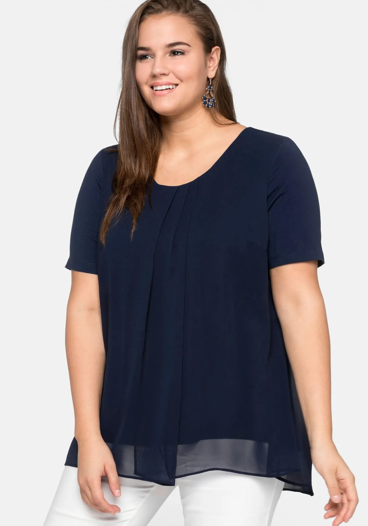 Das Oberteil in A-Linie fällt locker über den Körper und macht das Shirt zum optischen Figurschmeichler. Darunter befindet sich das figurnahe Innenteil.