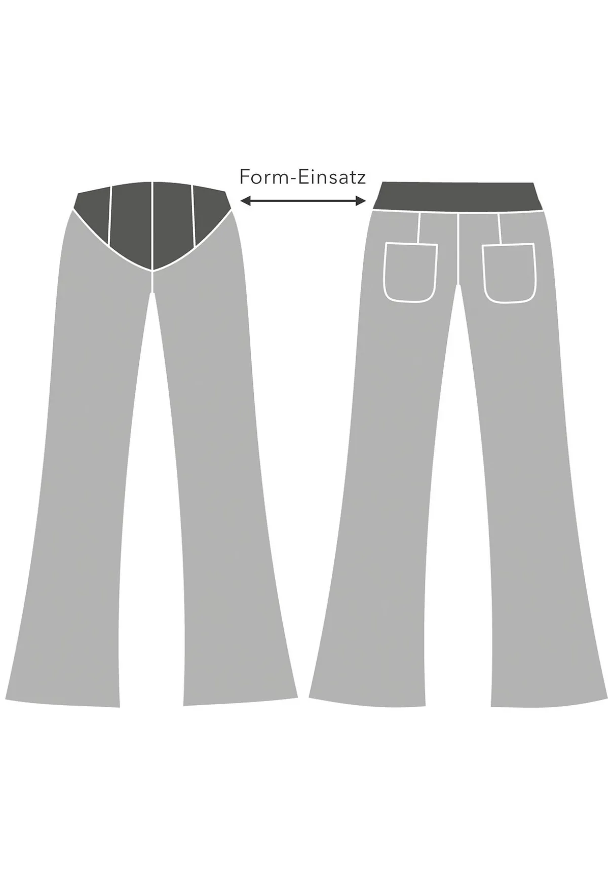 Die doppellagige Passe vorn formt die Bauchpartie, der hohe Bund unterstreicht den Effekt.