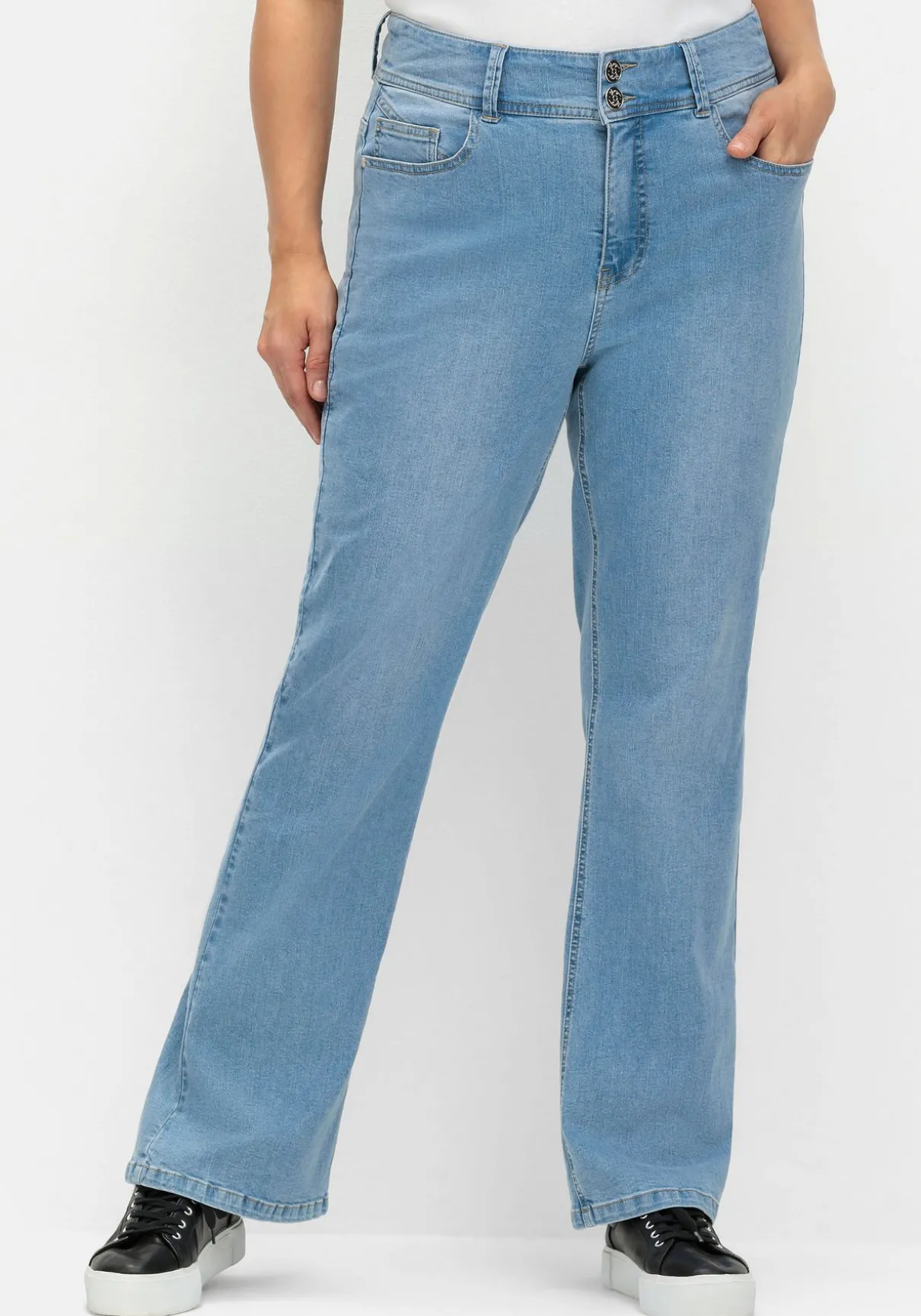 Bootcut-Jeans in Curvy-Schnitt MANUELA, bei schmalerer Taille und kräftigen Oberschenkeln. Die Hose besitzt einen High-Waist-Bund, der durch die beiden Knöpfe zum Eyecatcher wird. Dazu kommen Reißverschluss und Gürtelschlaufen, für einen besseren Sitz sind diese hinten V-förmig gearbeitet. Die klassischen fünf Taschen werden durch Nähte am Eingriff betont, eine individuelle Waschung und kontrastfarbene Nähte machen den Look perfekt.