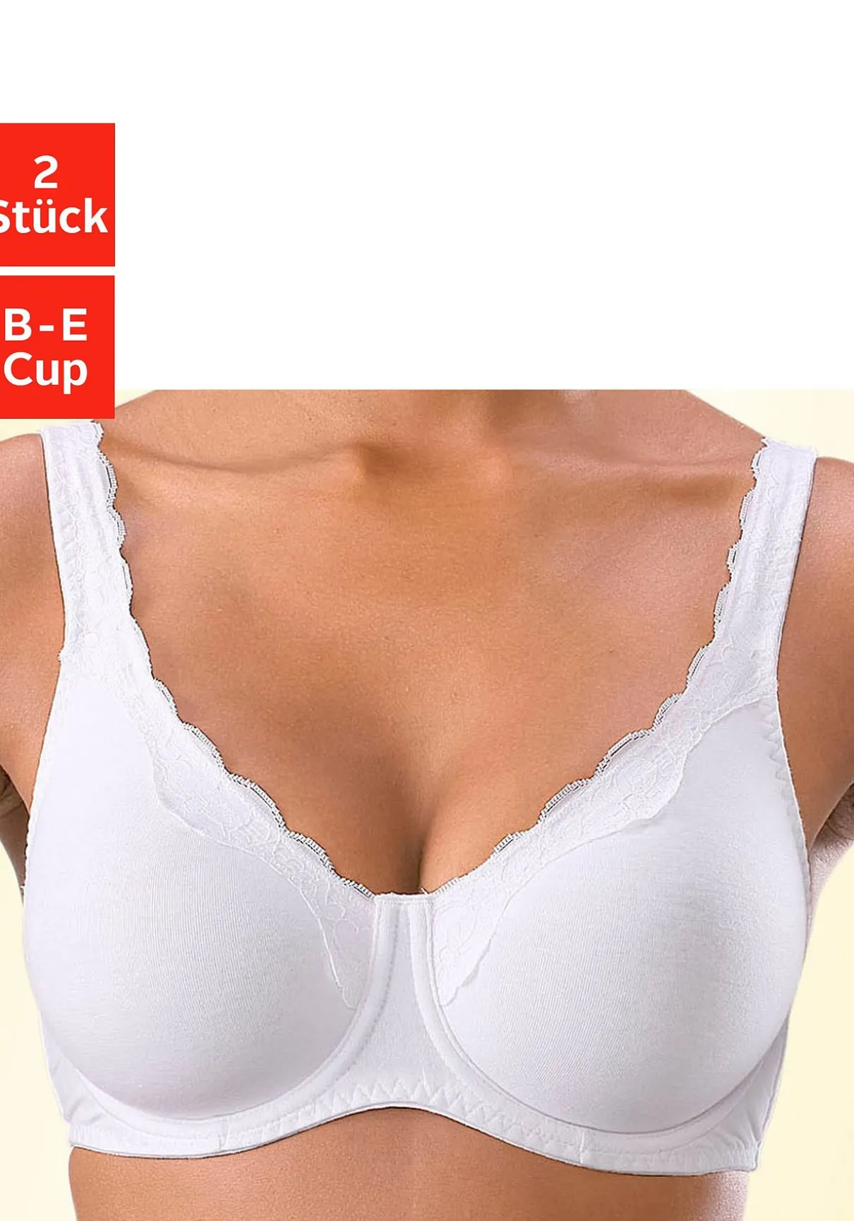 Mit nahtlos vorgeformten, doppellagigen Cups (ohne Wattierung). Schönes Spitzenband entlang der Cupkante. Träger und Rückenverschluss verstellbar. Der Bügel-BH ist aus 85% Baumwolle, 10% Polyamid, 5% Elasthan. BHs sind nicht trocknergeeignet, da die Versteller und Ringe durch die Hitze beschädigt werden und brechen.