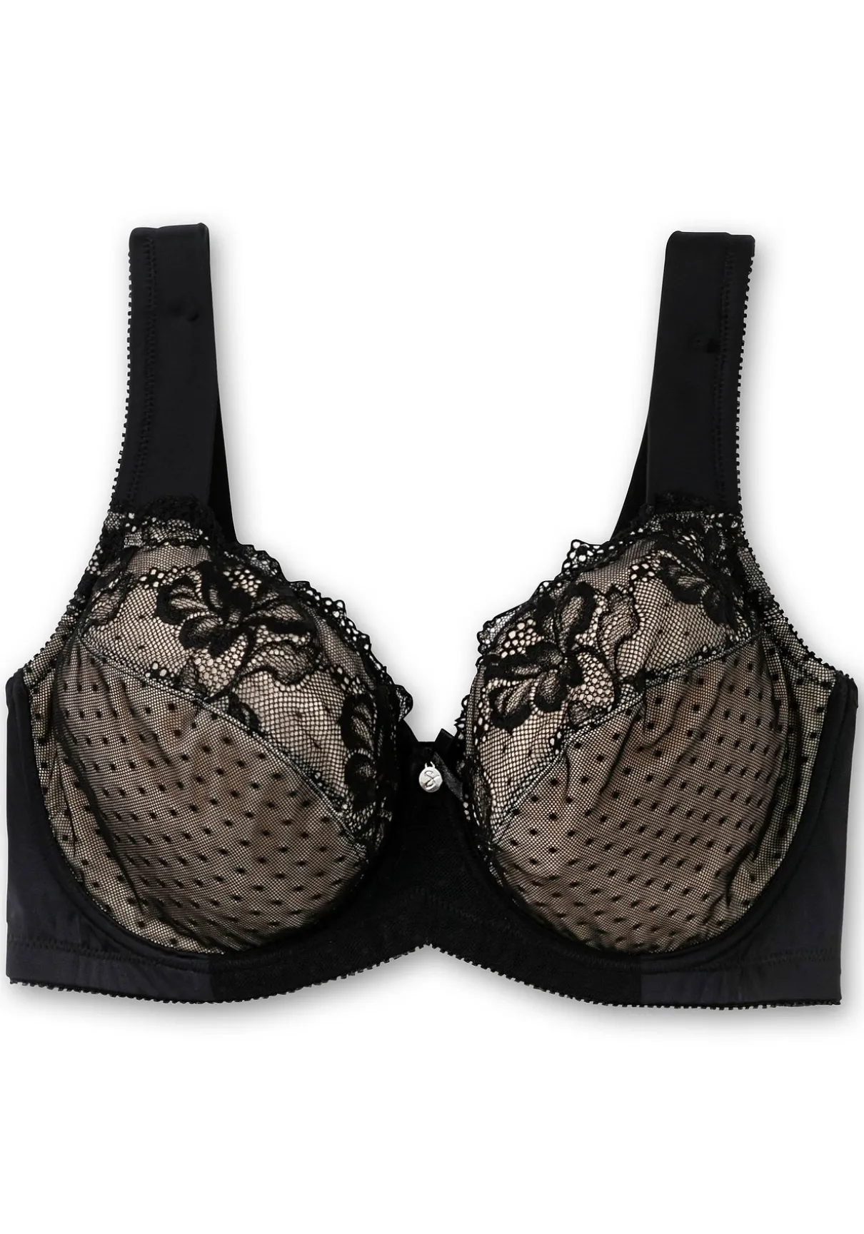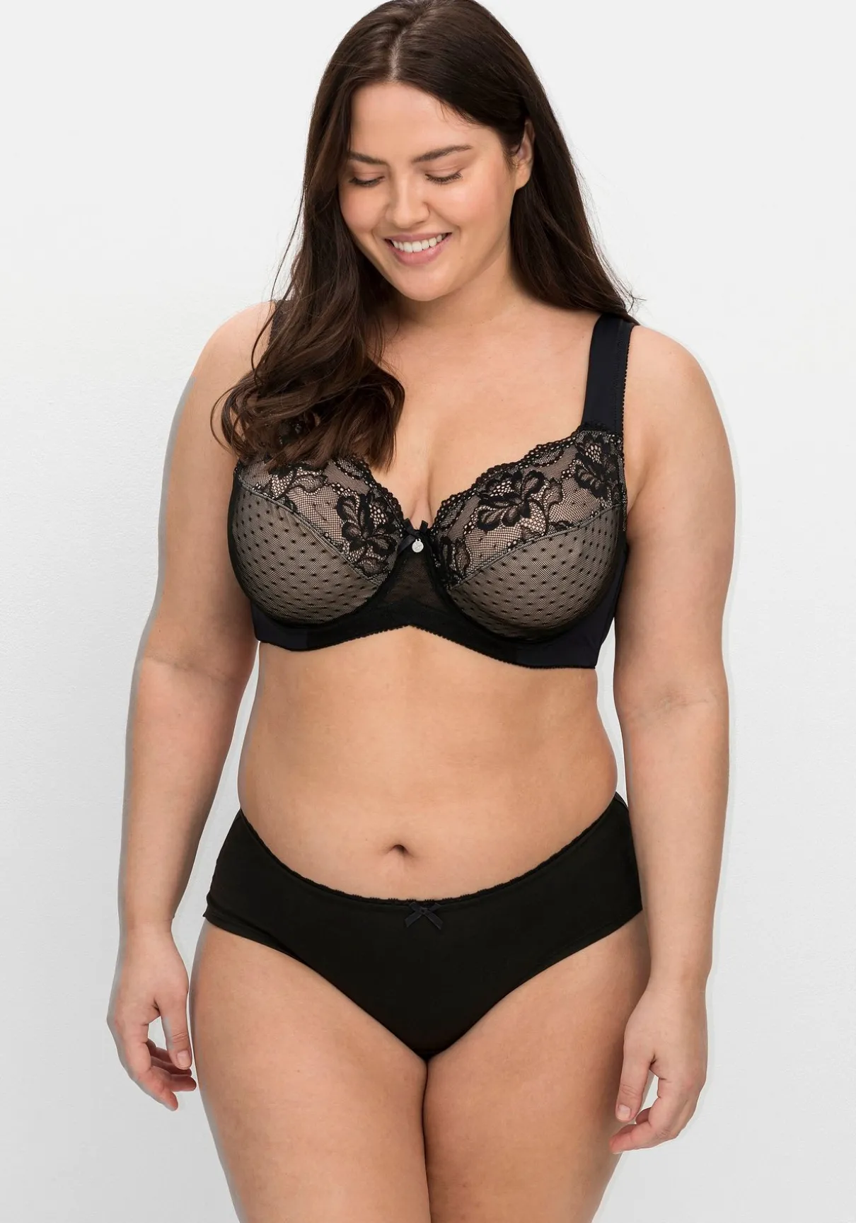 Bügel-BH mit dekorativer Spitze. Der unterlegte Mesh setzt dazu einen verführerischen Kontrast, die Schleife und das Metalllabel schmücken den Steg zwischen den Cups. Bügel sowie eingenähte seitliche Stützen geben perfekten Halt und sorgen für optimalen Tragekomfort. Durch den hohen Mittelsteg wird die Brust gut abgedeckt und stützt zusätzlich die Brust. Auch die breiten, elastischen Träger schneiden nicht ein.