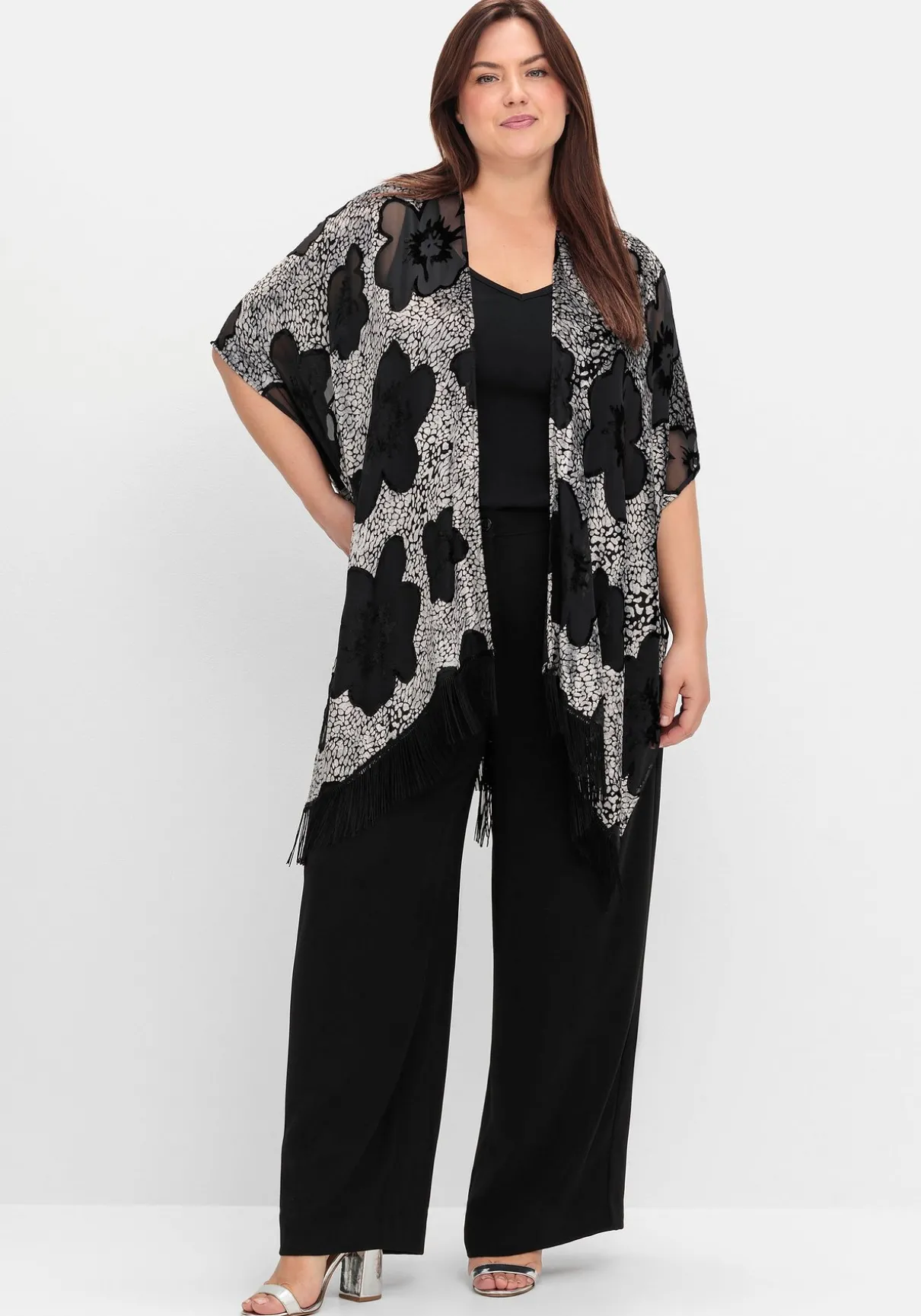 Cape im Kimono-Stil von sheego by Joe Browns. Der elegante Mix aus leicht transparentem Ausbrennermuster und Applikationen in Samt-Optik macht aus jedem Teil ein Unikat. Das Cape ist mit V-Ausschnitt und überschnittenen 3/4-Ärmeln gearbeitet. Fransen am Saum und hohe seitliche Schlitze setzen modische Akzente. Durch die verschlusslose Form lässt sich der Style locker überwerfen – ein vielseitiger Begleiter, der Alltagslooks eine besondere Note verleiht, aber auch zu besonderen Anlässen glänzt.