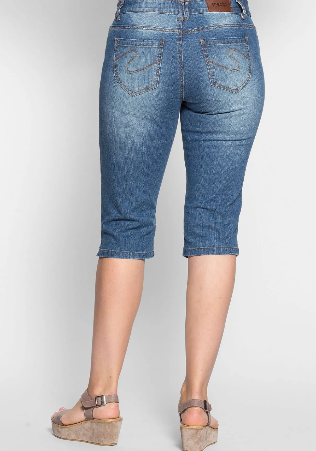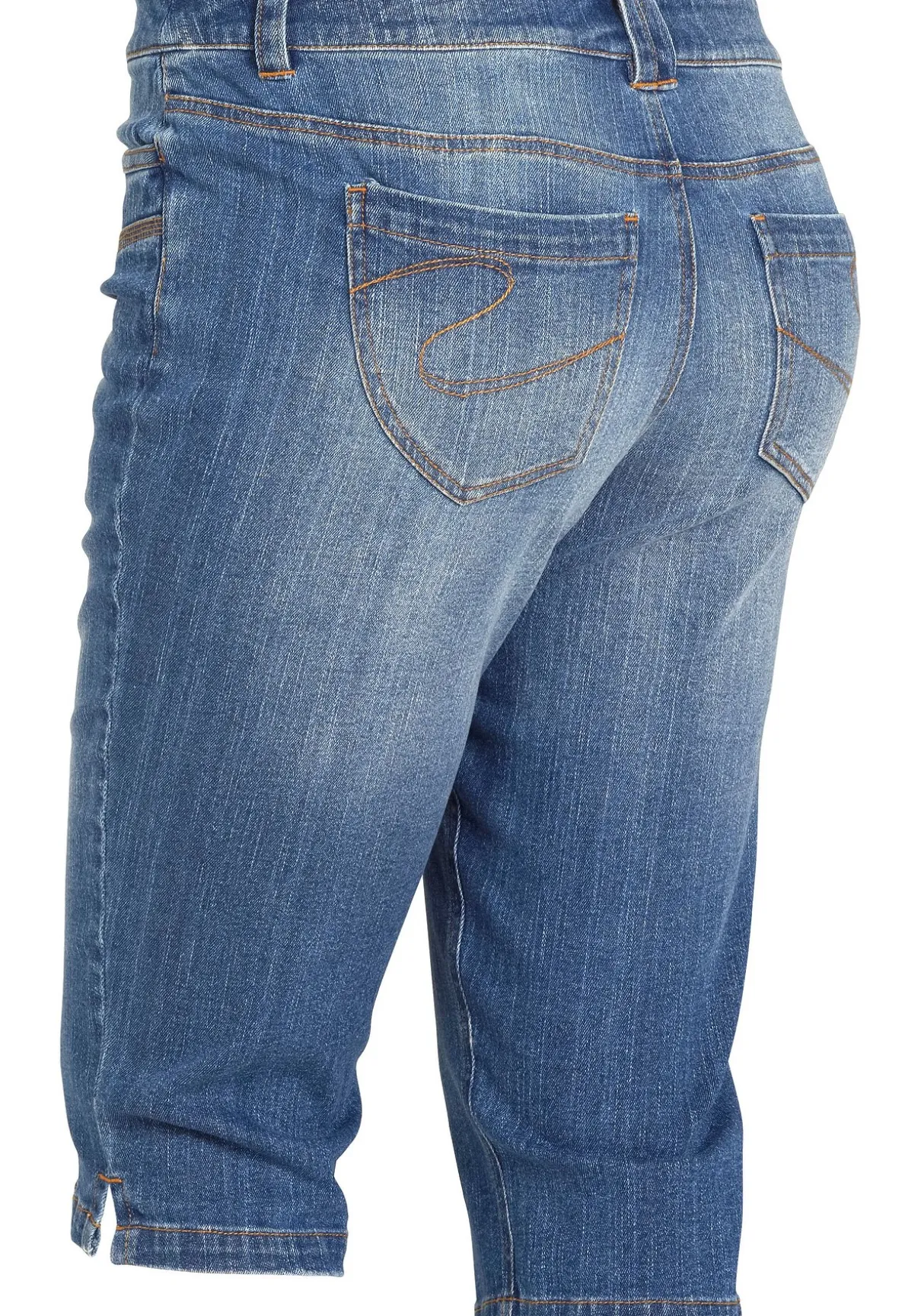 Modischer Begleiter durch warme Tage: Die schmale Jeans-Capri begeistert mit einer angenehmen Länge und schlichtem Design. Zwei Eingrifftaschen vorn, seitliche Schlitze am Bein sowie Gürtelschlaufen sorgen für praktische Details. Dezente Stickereien an den beiden aufgesetzten Gesäßtaschen tragen zum sportiven Look der Hose bei. Ein Teil, das in jeden Kleiderschrank gehört!