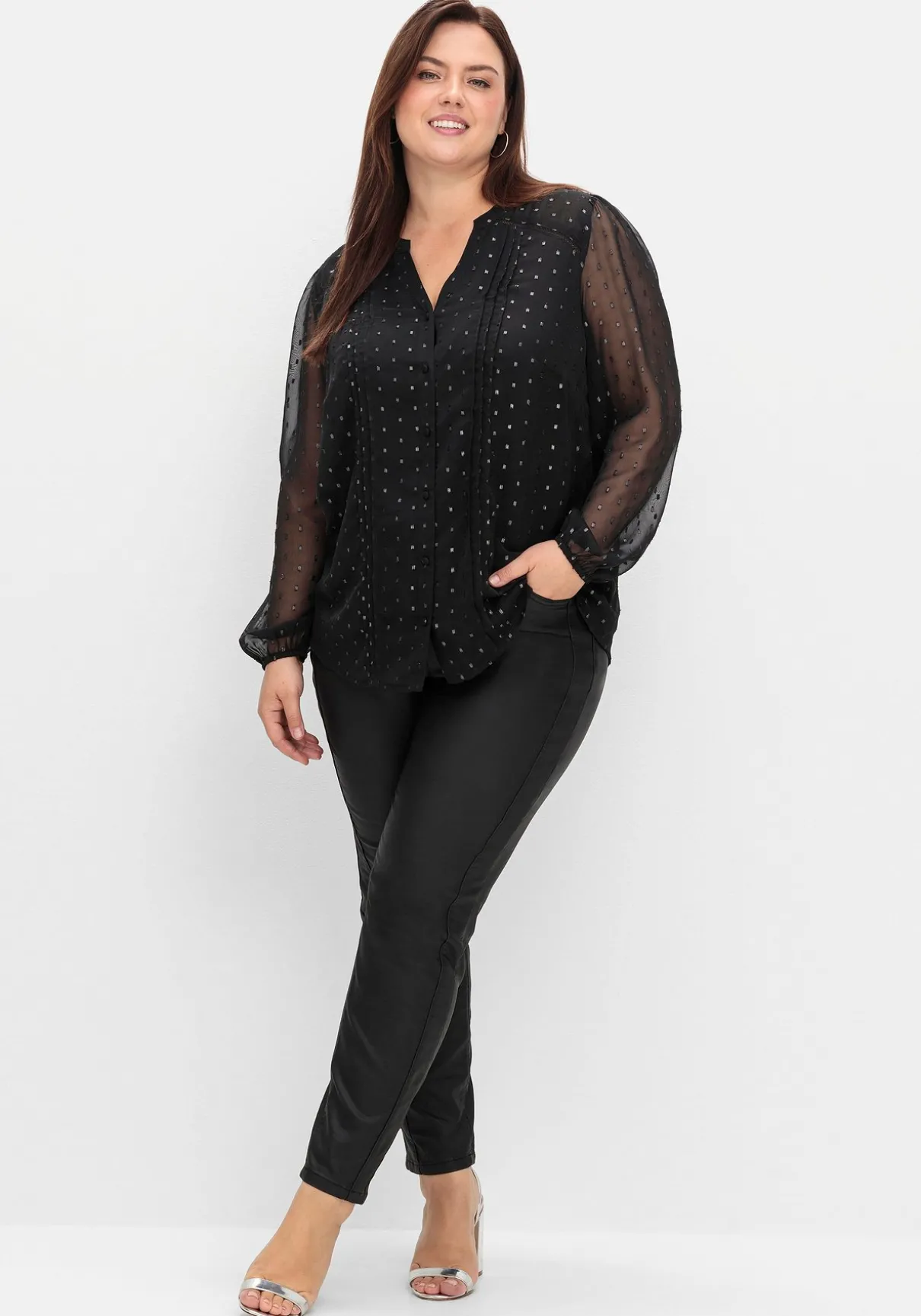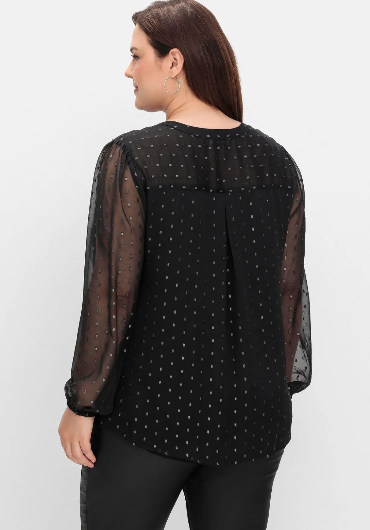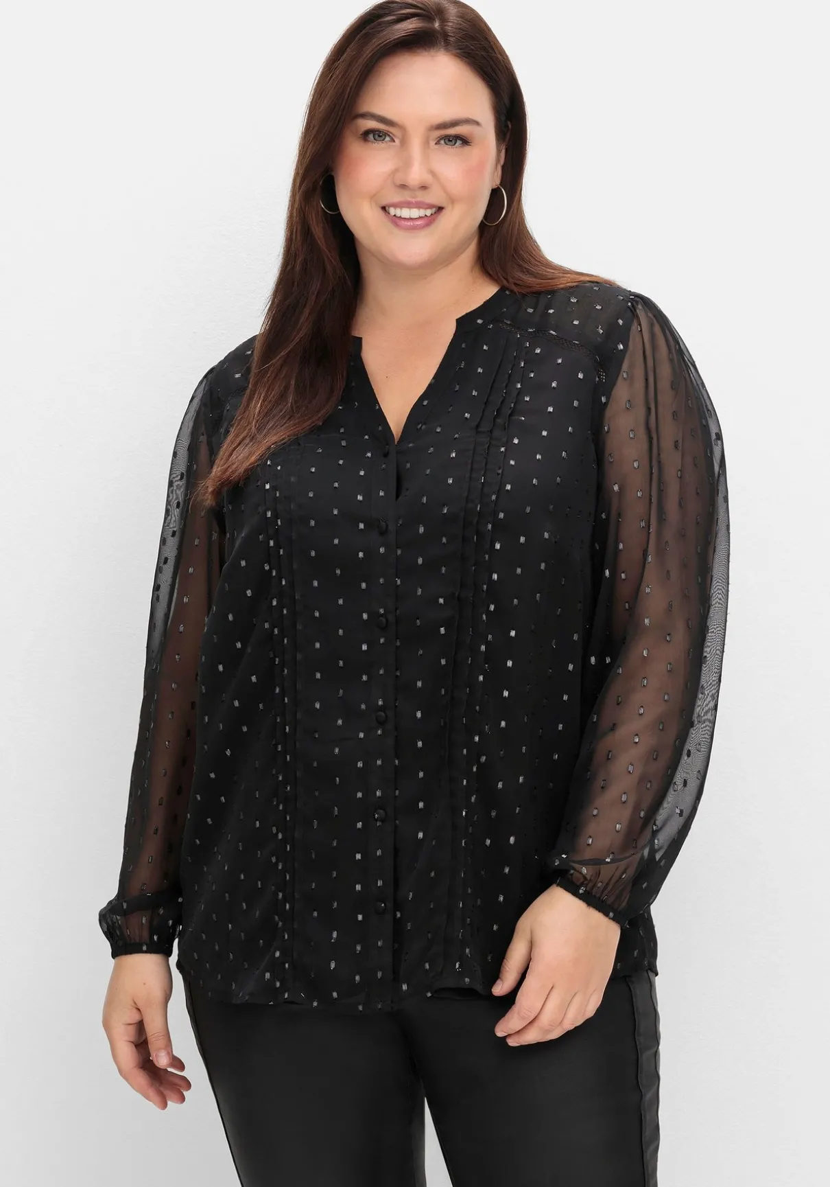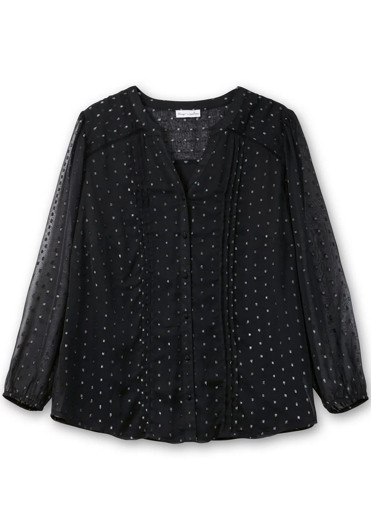 Chiffonbluse von sheego by Joe Browns. Die zarte Chiffonqualität und der in Dobby-Struktur eingewebte Glanzfaden verleihen der Bluse eine raffinierte, elegante Optik. Dabei bleiben die Ärmel leicht transparent, der Body wird durch das Jerseyfutter blickdicht. Vorn ist die Bluse mit Rundhalsausschnitt und V-Schlitz gearbeitet, Biesen, Spitze und stoffüberzogene Knöpfe unterstreichen den romantischen Auftritt. Die Ärmel sind am Ansatz leicht gekräuselt und enden mit elastischen Bündchen. Auch die Passe im Rücken ist leicht transparent, eine Kellerfalte sorgt für luftige Weite und einen schönen Fall.