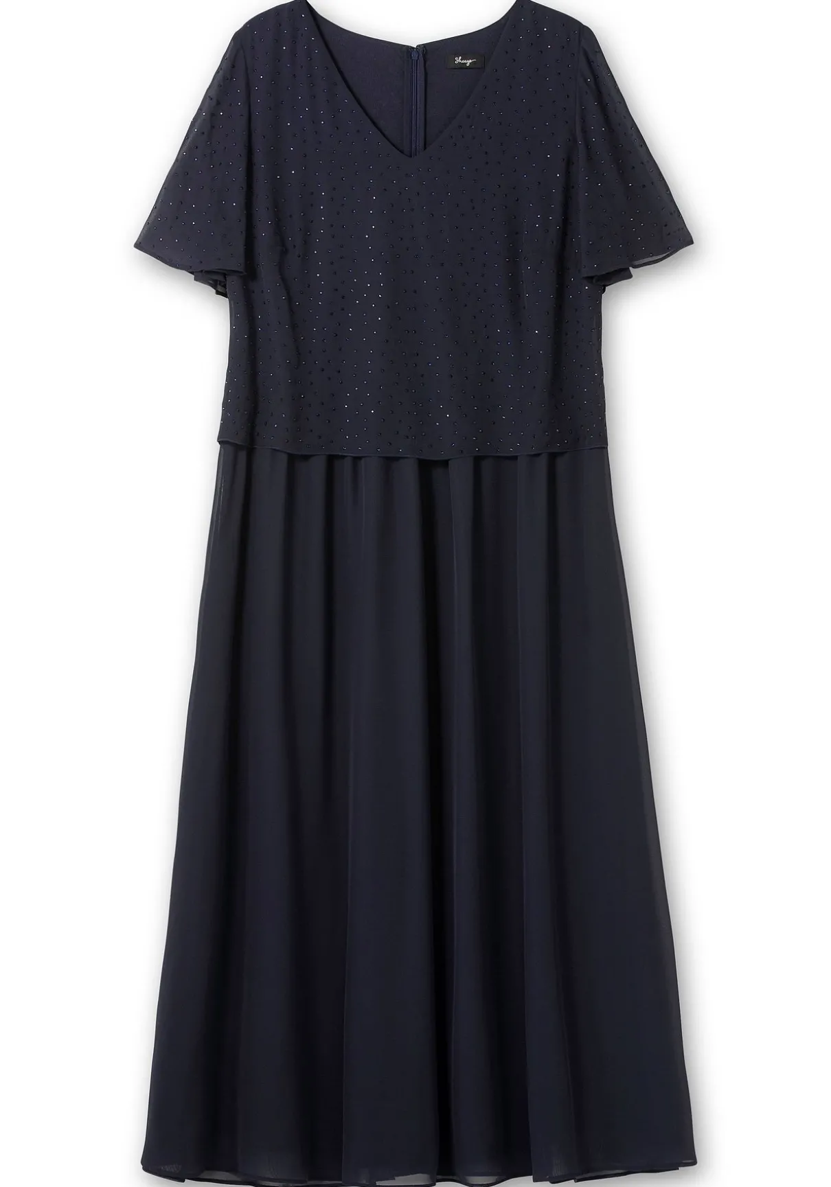 Abendkleid aus feinem Chiffon. Durch die raffinierte Lagenoptik erhält das Kleid einen besonders schönen Fall, die vielen kleinen Schmucksteinchen am Oberteil sorgen für den Glamour-Effekt. Dabei bleiben die 3/4-langen Ärmel leicht transparent und verleihen dem Kleid eine luftige und feminine Optik. Der V-Ausschnitt mit nahtfeinem Reißverschluss hinten ermöglicht einen bequemen Einstieg.
