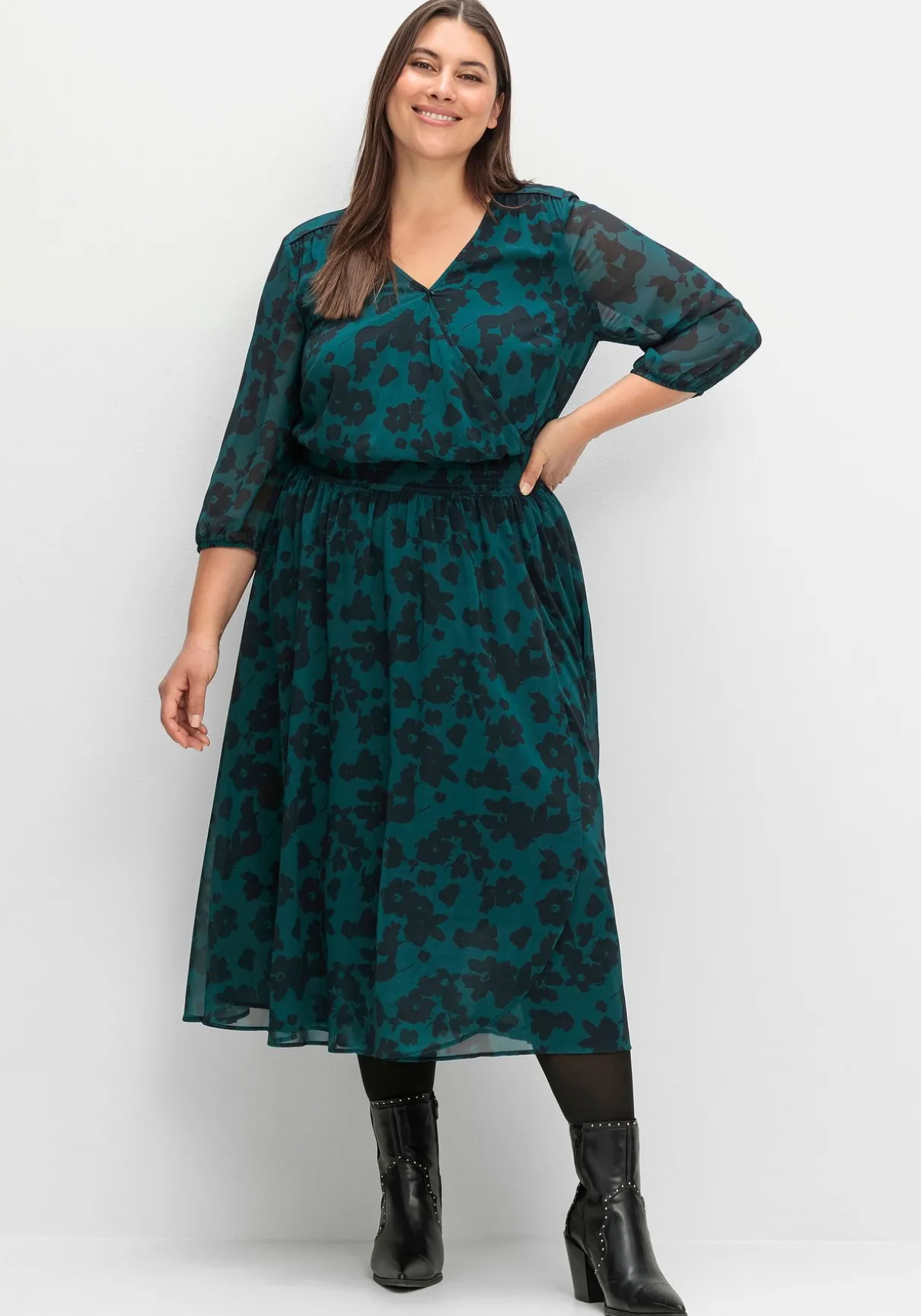 Midikleid aus Chiffon. Der abstrakte Blütenprint verleiht dem Kleid eine moderne Optik und kommt auf dem leicht transparenten Material besonders schön zur Geltung. Ein trageangenehmes Futter macht das Kleid am Body blickdicht, nur die Ärmel bleiben leicht transparent und lassen dezent die Haut durchschimmern. Der V-Ausschnitt in Wickeloptik streckt geschickt den Oberkörper, der breite Smokbund in der Taille betont die feminine Silhouette. Daran schließt sich ein weit schwingender Rock in Midilänge an.