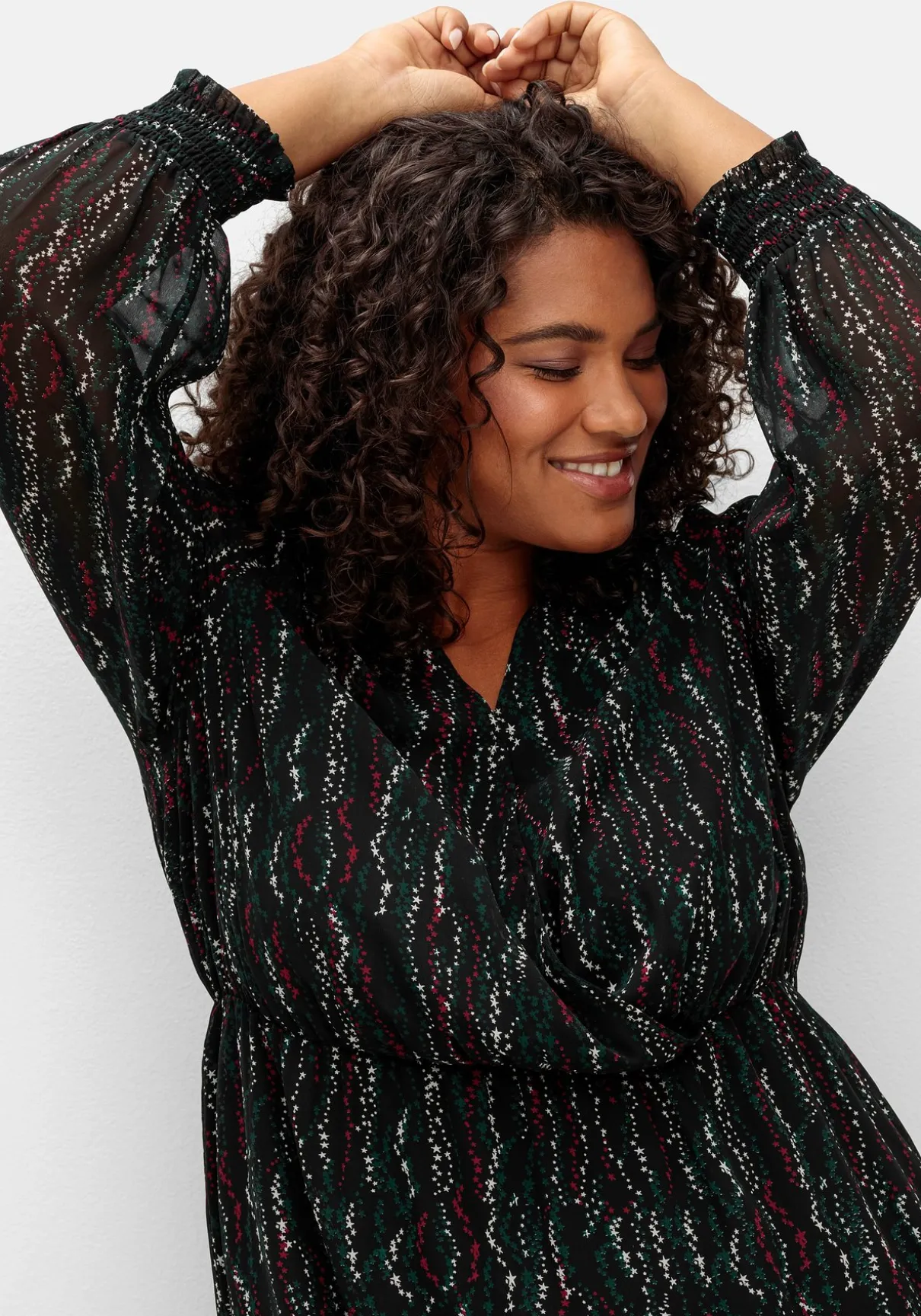 Chiffonkleid mit Alloverprint. Der überlappend gearbeitete V-Ausschnitt lässt eine feminine Wickeloptik entstehen. Lange, transparente Ärmel mit gesmoktem Bündchen, der Gummizugbund an der Taille und der weit schwingende Rock verleihen dem Kleid eine feminine Silhouette.