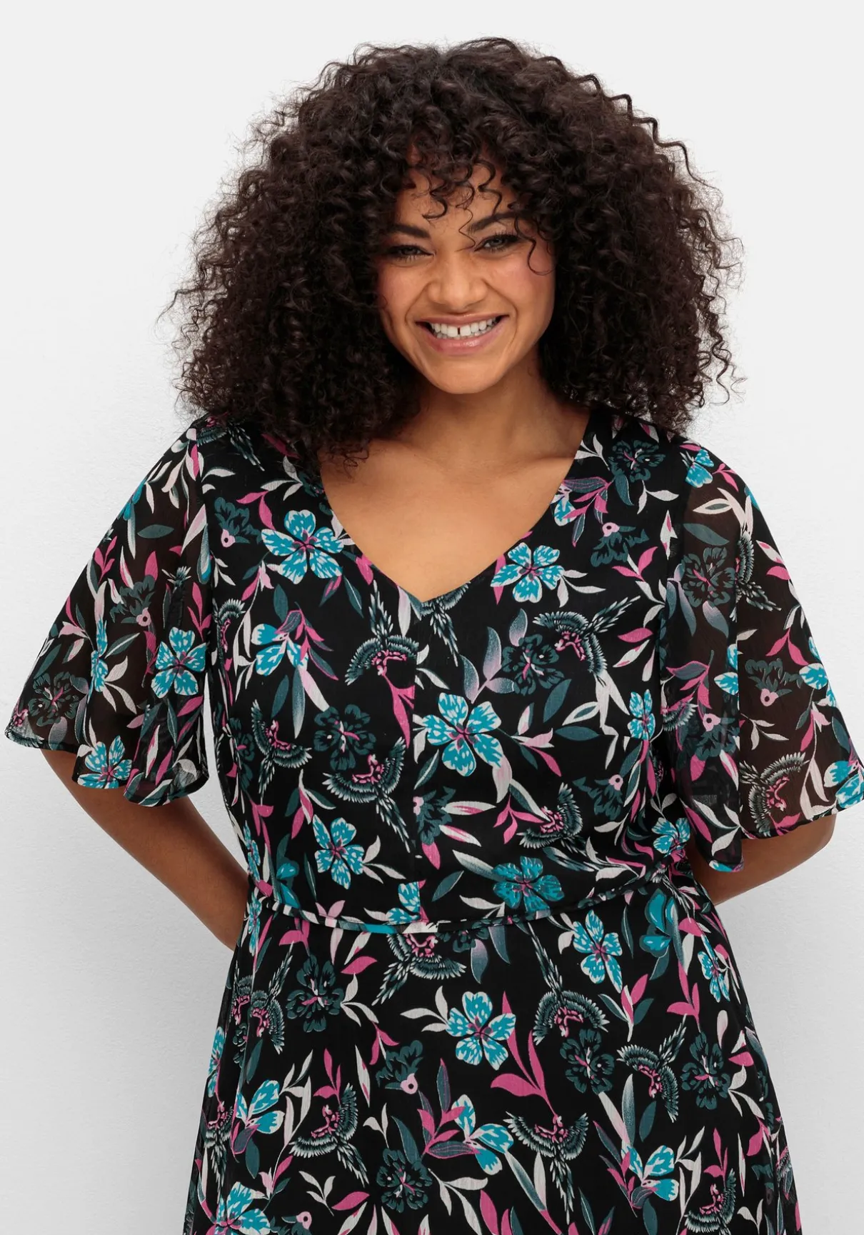 Chiffonkleid von sheego by Joe Browns. Auf dunklem Fond kommt der elegante Blumendruck besonders schön zur Geltung – hier ist jedes Teil ein Unikat. Die Teilungsnaht unterhalb der Brust gibt der Silhouette Form, darunter schließt sich das weit schwingende Rockteil mit verspieltem Volant am Saum an. Leicht transparente Flügelärmel und ein nahtfeiner Reißverschluss im Rücken machen den femininen Look komplett.