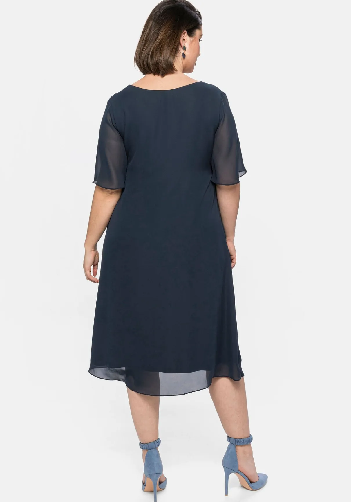 Chiffonkleid in leicht ausgestellter A-Linie. Für feminine Eleganz sorgt die obere Lage aus leicht transparentem Chiffon, das Unterkleid aus elastischem Single-Jersey macht den Look absolut blickdicht. Der ansonsten sehr cleane Schnitt kommt mit Rundhals und kleinem V-Ausschnitt. Glänzende Highlights setzen dabei die unterschiedlich großen Schmucksteine, die den Ausschnitt hübsch einrahmen. Semintransparente Flügelärmel ergänzen den festlichen Style.