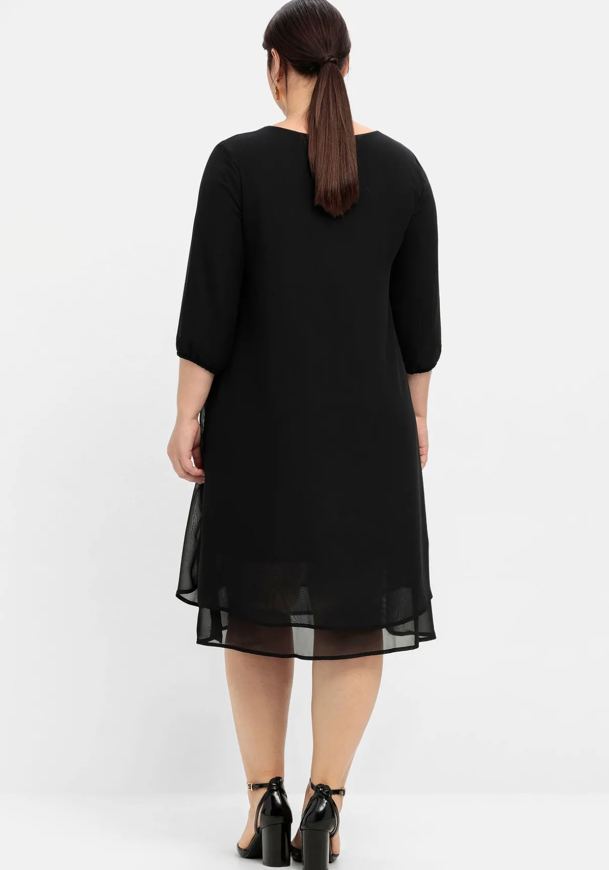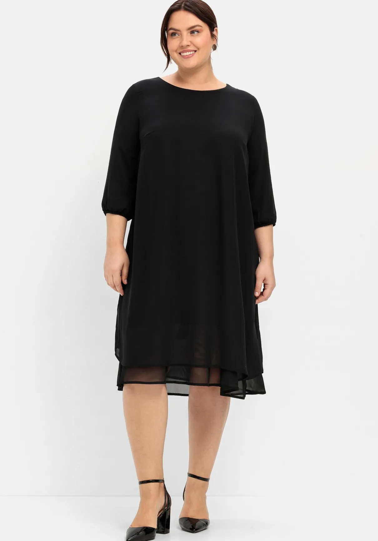 Kleid im Layerlook. Für eine feminine, elegante Optik sorgt die obere Lage aus leicht transparentem Chiffon, die untere Lage aus fließender, elastischer Viskose macht den Look blickdicht. Der ansonsten sehr cleane, reduzierte Schnitt zeigt sich mit Rundhalsausschnitt und leicht ausgestelltem Saum. Die 3/4-Ärmel enden mit Gummizugbund.