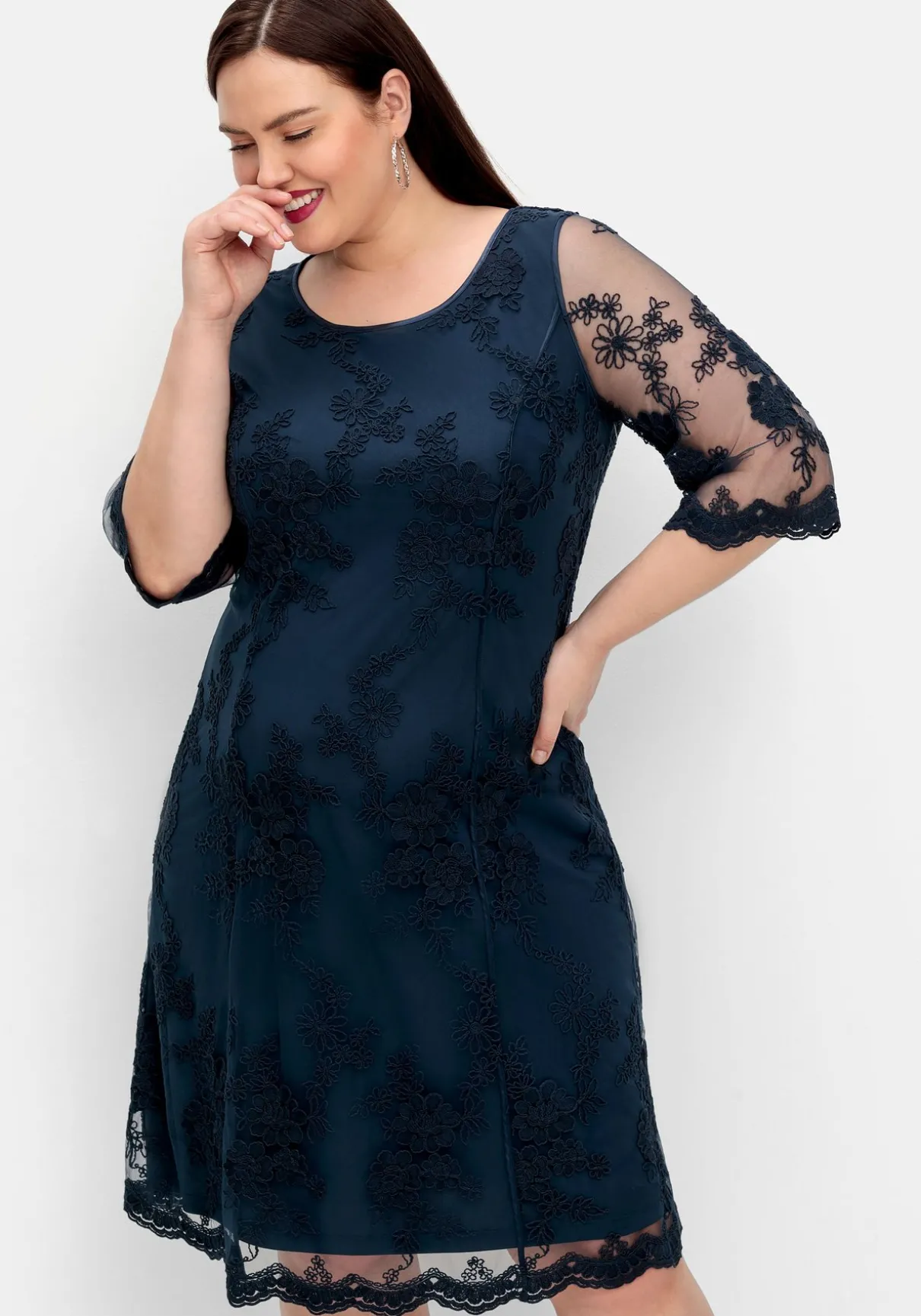 Cocktailkleid aus Mesh. Durch die florale Stickerei wirkt das Kleid besonders elegant. Dabei lässt die leicht transparente Qualität am 3/4-Arm dezent die Haut durchschimmern, der Body wird durch das Unterkleid blickdicht. Ein nahtfeiner Reißverschluss im Rücken ergänzt den festlichen Look.