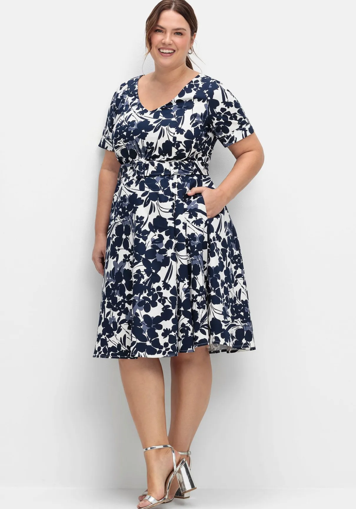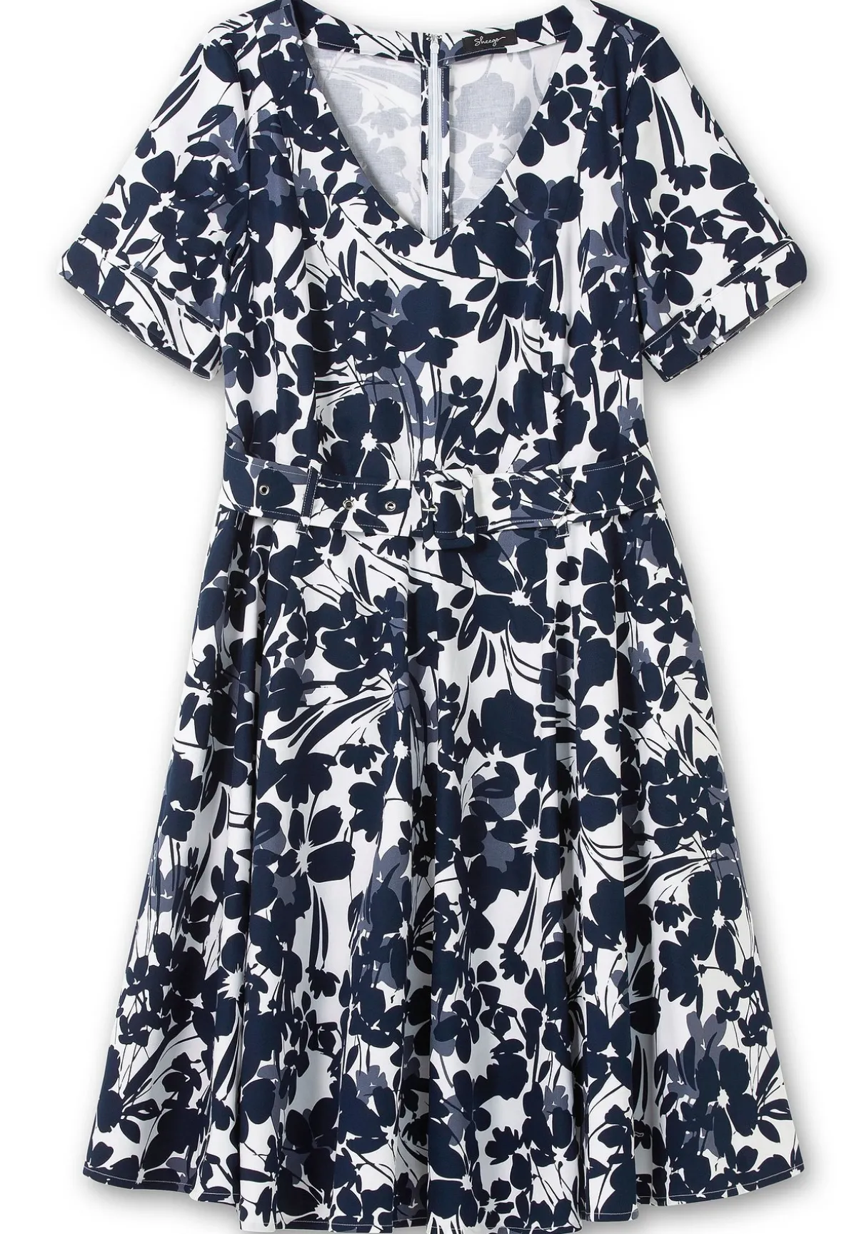 Cocktailkleid in knieumspielender Länge. Durch den dunklen Blumenprint auf hellem Untergrund wirkt das Kleid feminin und elegant. Der etwas tiefere V-Ausschnitt ist im Rücken mit einem nahtfeinen Reißverschluss gearbeitet. Ein Stoffgürtel betont dekorativ die Taille, praktisches Finish sind die seitlichen Nahttaschen.