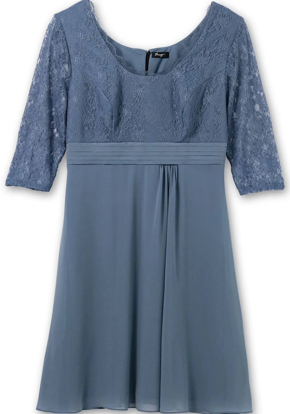 Feminin und zeitlos wirkt dieses festliche Kleid, das sich durch zarte florale Spitze an Ärmeln und Oberteil auszeichnet. Kleine Falten in der Taille und ein leicht ausgestellter Chiffonrock betonen den charmanten Party-Look. Die transparenten, 3/4-langen Ärmel und der blickdicht gefütterte Body bilden eine aufregende und gleichzeitig sehr trageangenehme Kombination. Das hochwertige Design wird durch den nahtfeinen Reißverschluss im Rücken komplettiert.