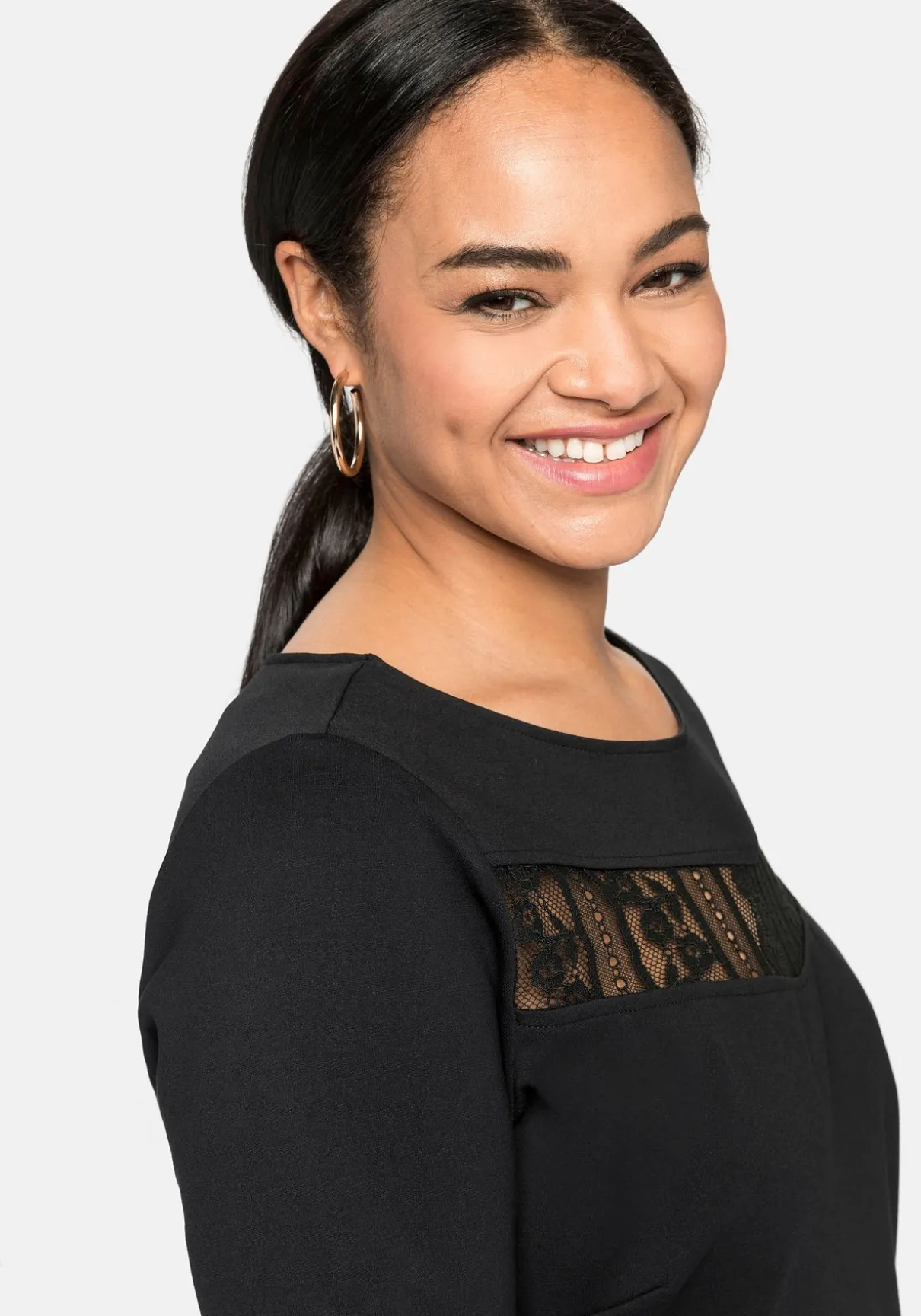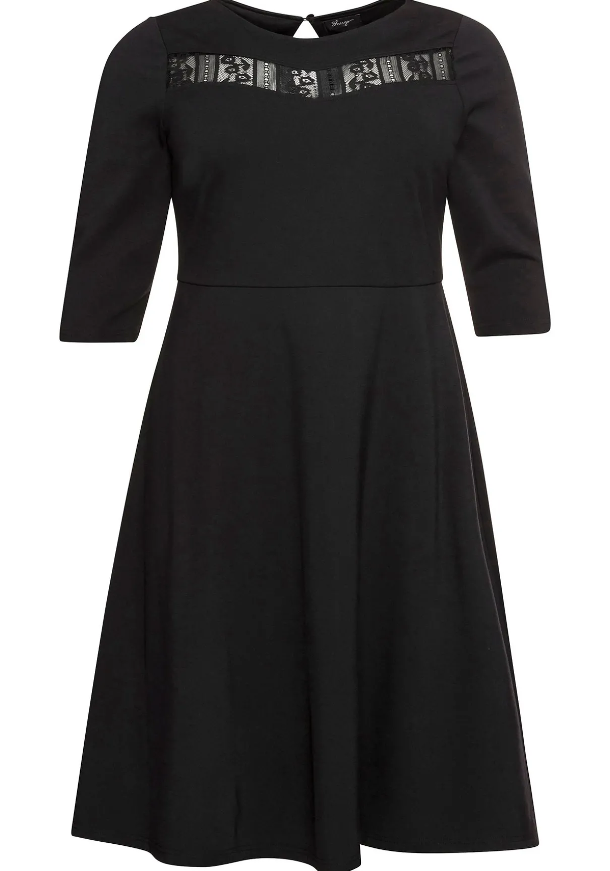 Abendkleid mit 3/4-Arm. Schlicht, aber sehr elegant wirkt das Kleid in angesagter Midilänge. Blickfang ist hier der transparente Spitzeneinsatz, der dezent die Haut durchschimmern lässt. Der feminine U-Boot-Ausschnitt geht hinten in einen Schlitz mit kleinem Knopfverschluss über. Eine Teilungsnaht in der Taille betont geschickt die Körpermitte, der anschließende Rock ist leicht ausgestellt und sorgt so für femininen Schwung.