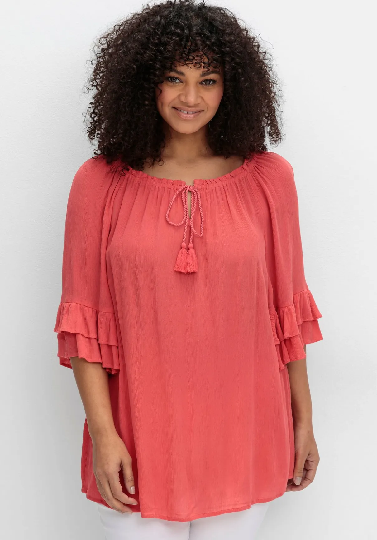 Crinkle-Tunika im romantischen Boho-Look von sheego by Joe Browns. Der weite, elastische Rundhalsausschnitt ist mit feinen Kräuselungen gearbeitet, der V-förmige Schlitz wird mit einem Bindeband geschlossen. Die locker fallenden, 3/4-langen Raglanärmel enden mit einem charmanten Rüschenabschluss.