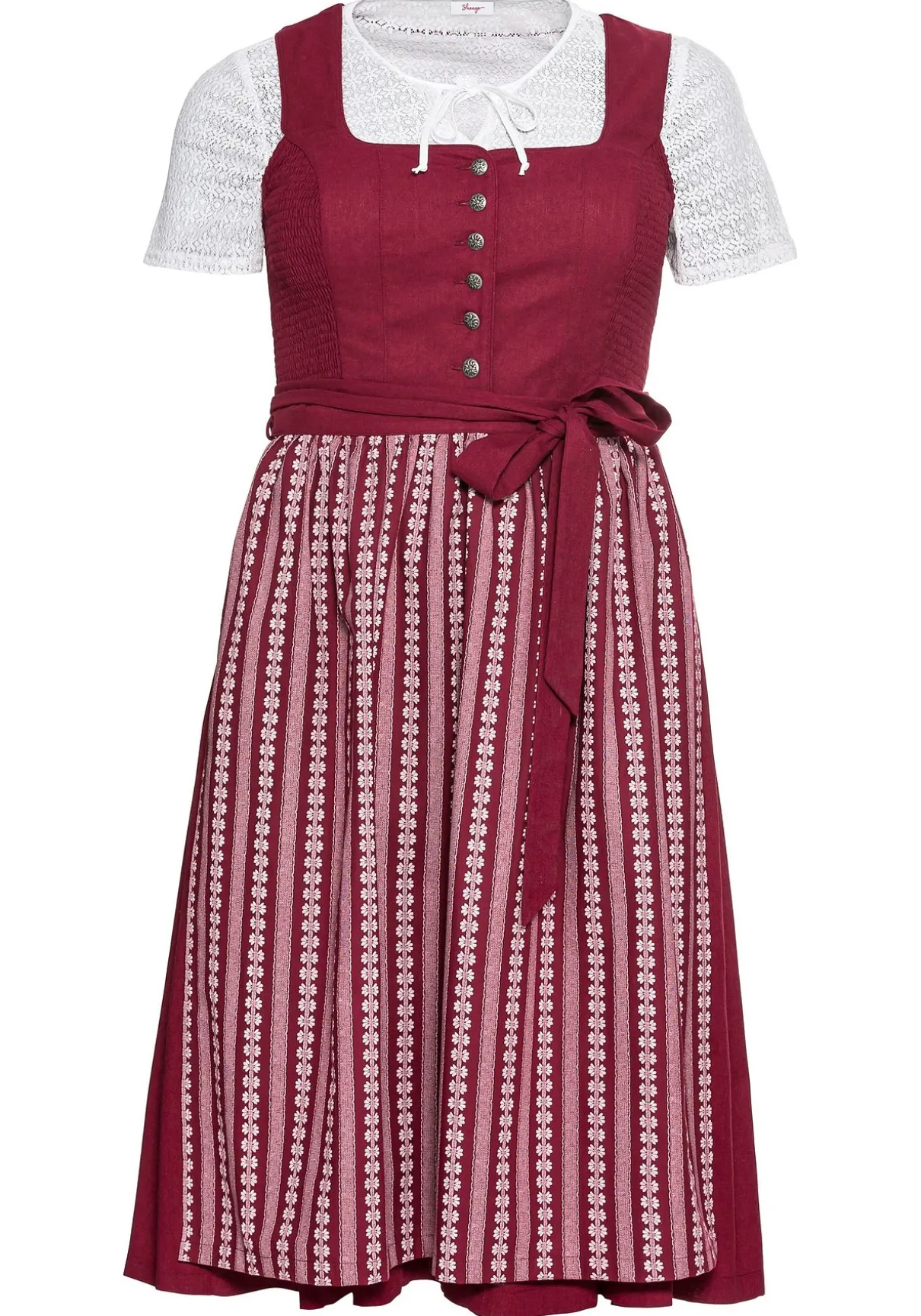 Dreiteiliges Dirndl mit Schürze und Spitzenbluse. Die Bluse aus zarter Spitze ist leicht transparent, der V-förmige Cut-out am Ausschnitt lässt sich mit einem Bindeband schließen. Darüber passt das traditionelle, ärmellos gearbeitete Kleid mit kurzer Knopfleiste. Teilungsnähte und Smokeinsätze sorgen am Oberteil für eine optimale Passform. Darunter schließt sich der weit schwingende Rock mit seitlichen nahtfeinen Taschen an. Der florale Druck auf der abknöpfbaren Schürze setzt dazu einen femininen Kontrast.