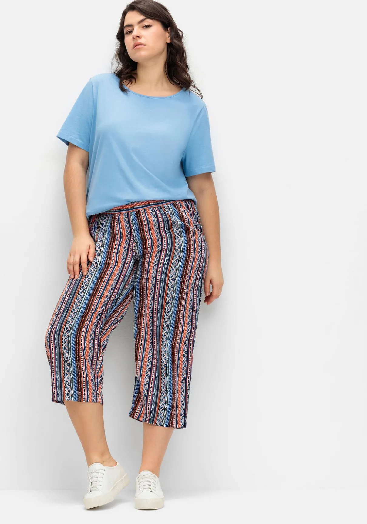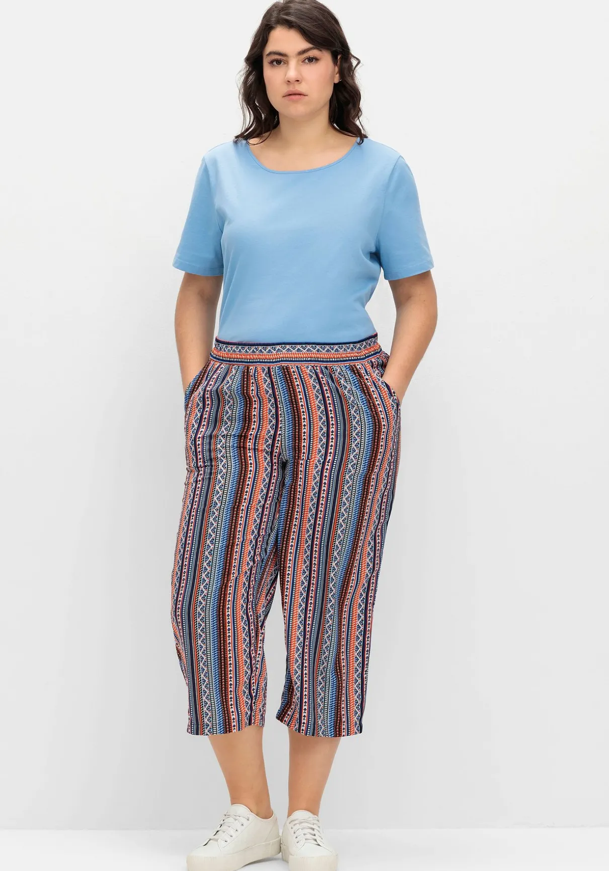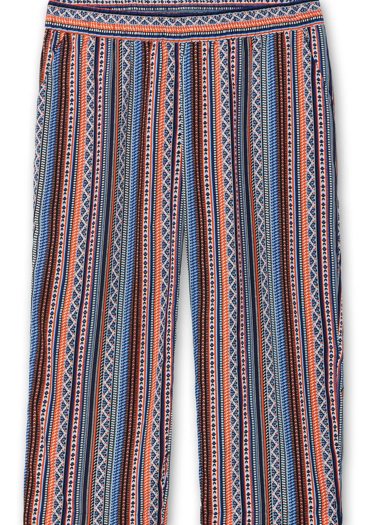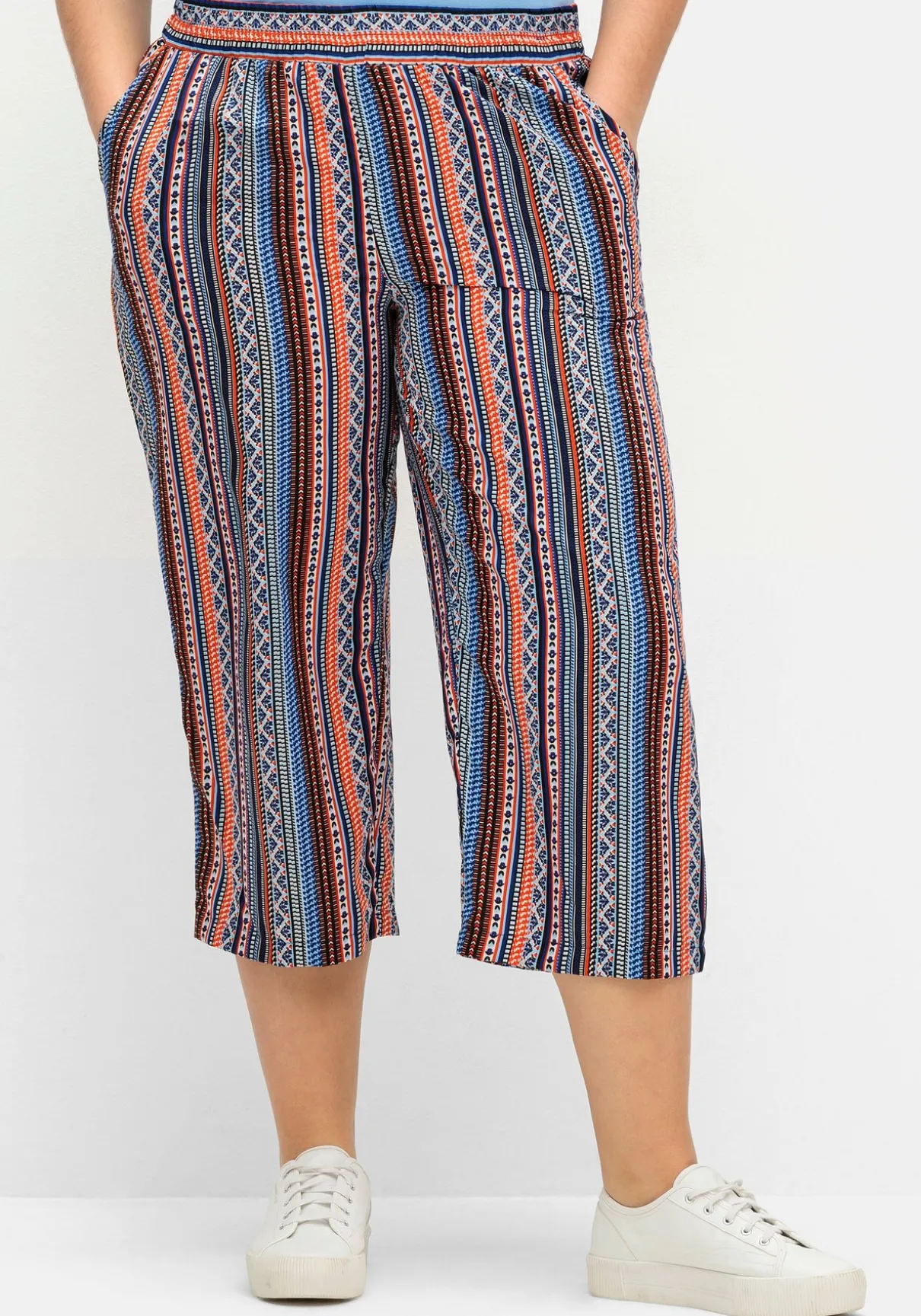 Schlupfhose im Doppelpack. Ob schlicht in Uni oder gestreift im Ethno-Look: Diese Hosen sind ideale Sommerbegleiter. Der elastische Bund trägt sich bequem, die weite und verkürzte Form sorgt für eine modische Silhouette. Praktische Eingrifftaschen ergänzen den Look.